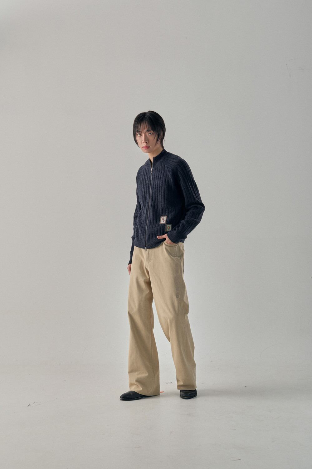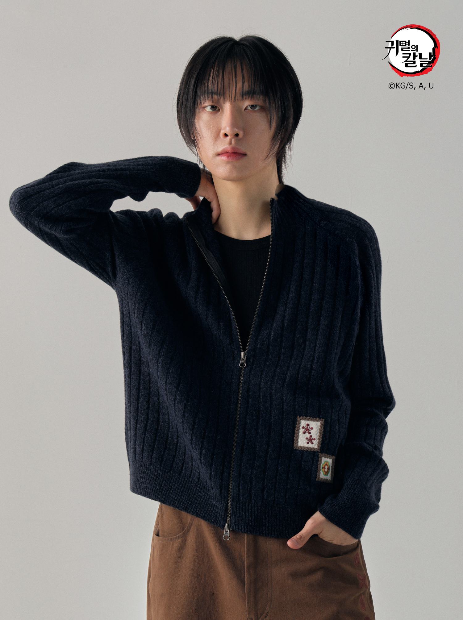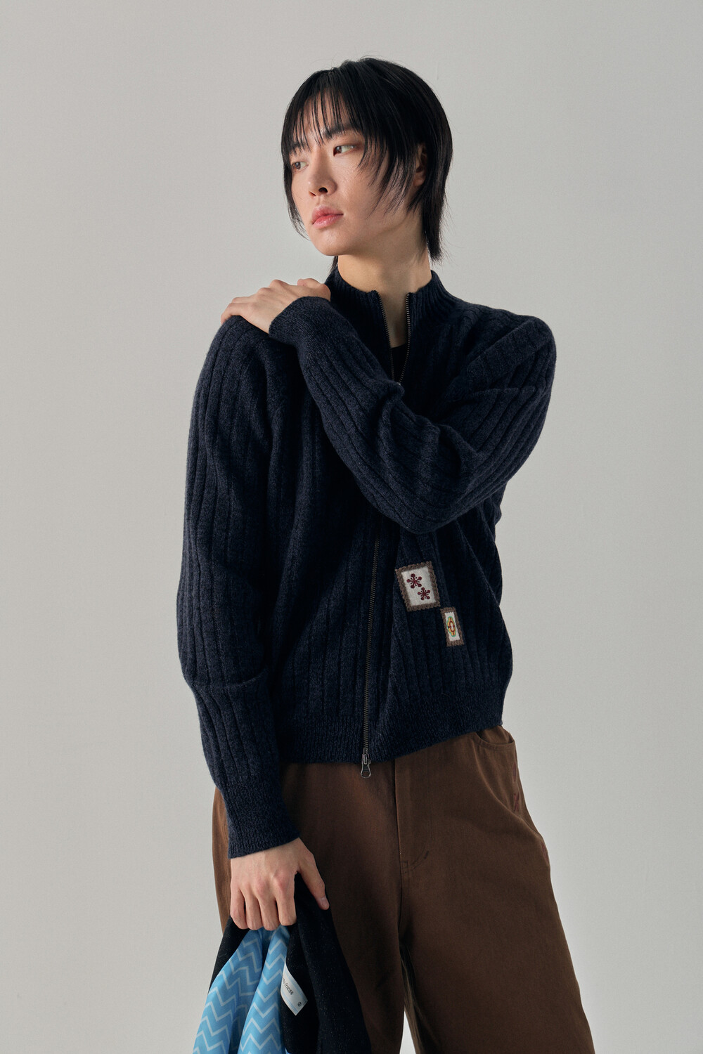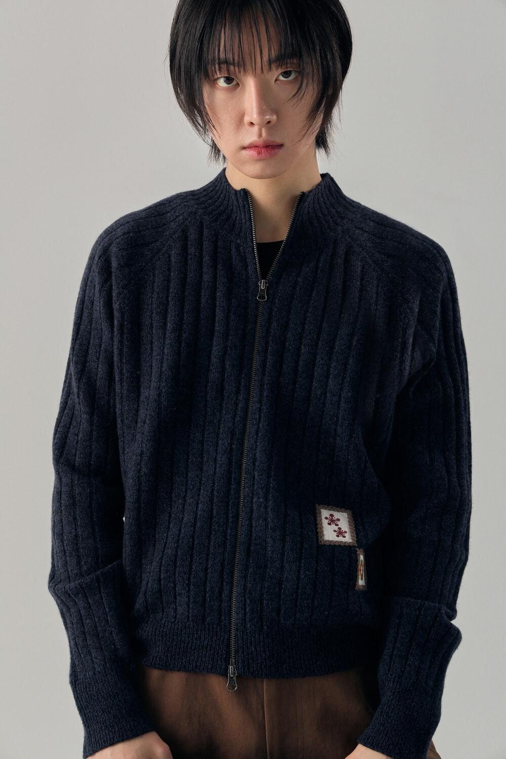 - 믹스드된 울 나일론 혼용 니트 패브릭 - 전면 캐릭터 모티브의 자수 패치 - 후면 웨이비니스 시그니처 디테일 - 목을 감싸는 모크넥 형태의 풀집업 - YKK 2WAY ZIPPER - 레글런 소매 - 레글런 어깨 부분에 절개라인과 미세한 봉제 작업을 통해 체형보완이 가능한 디자인