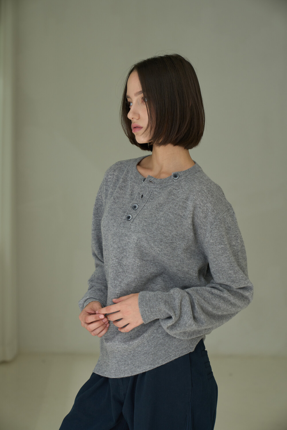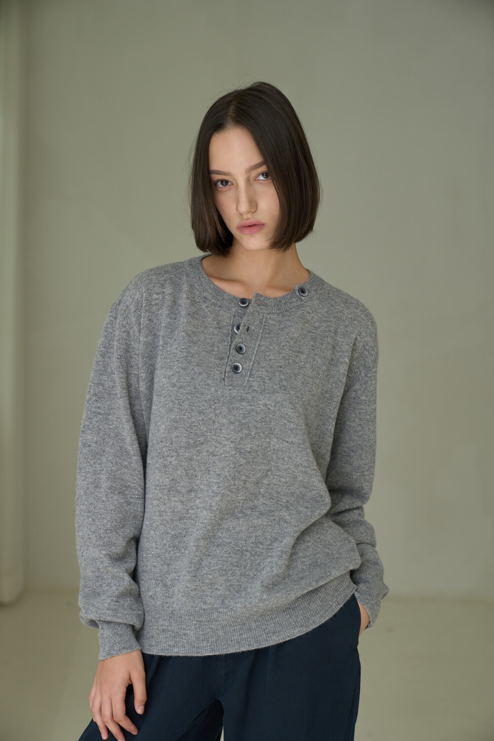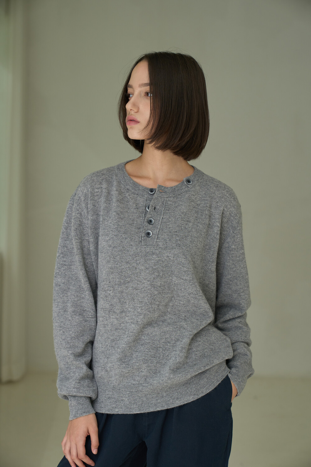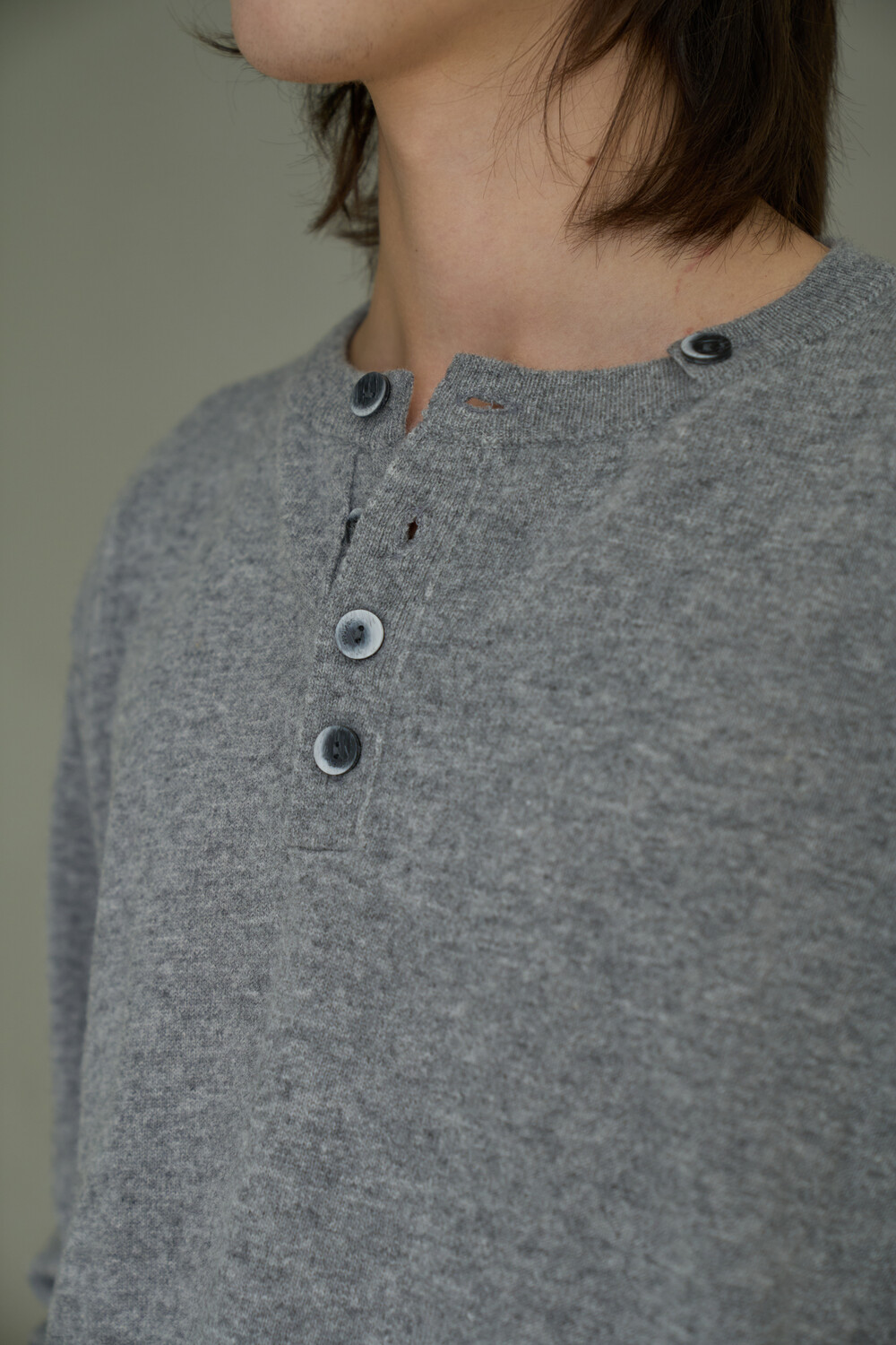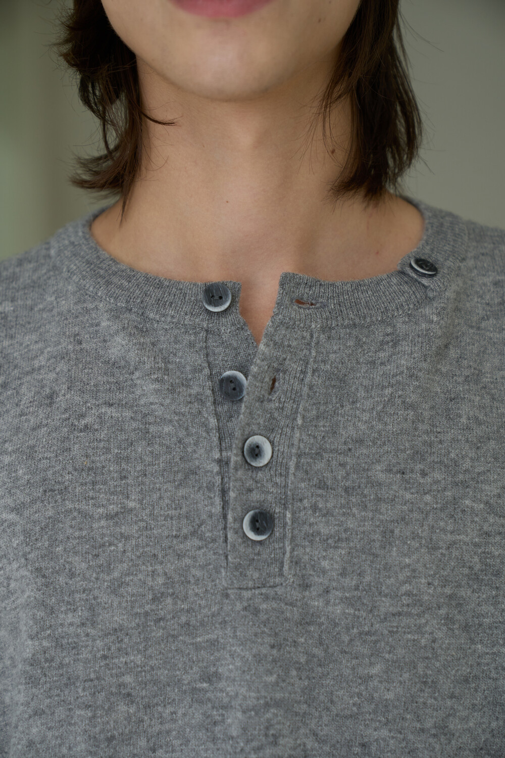 Button Pullover Henley-neck Knit - Grey