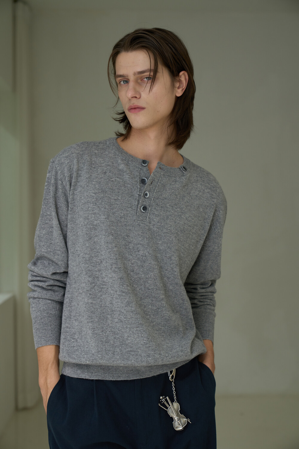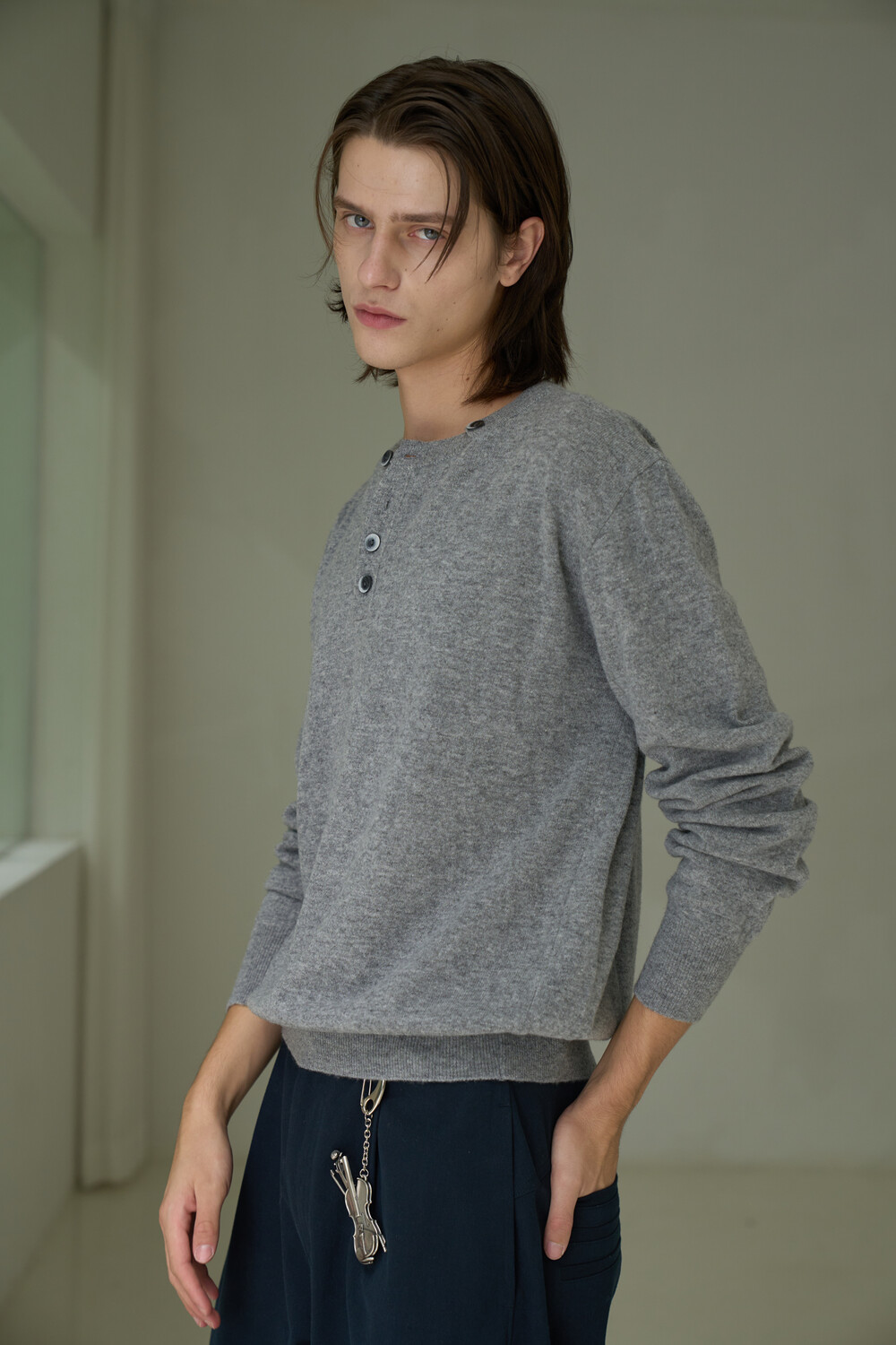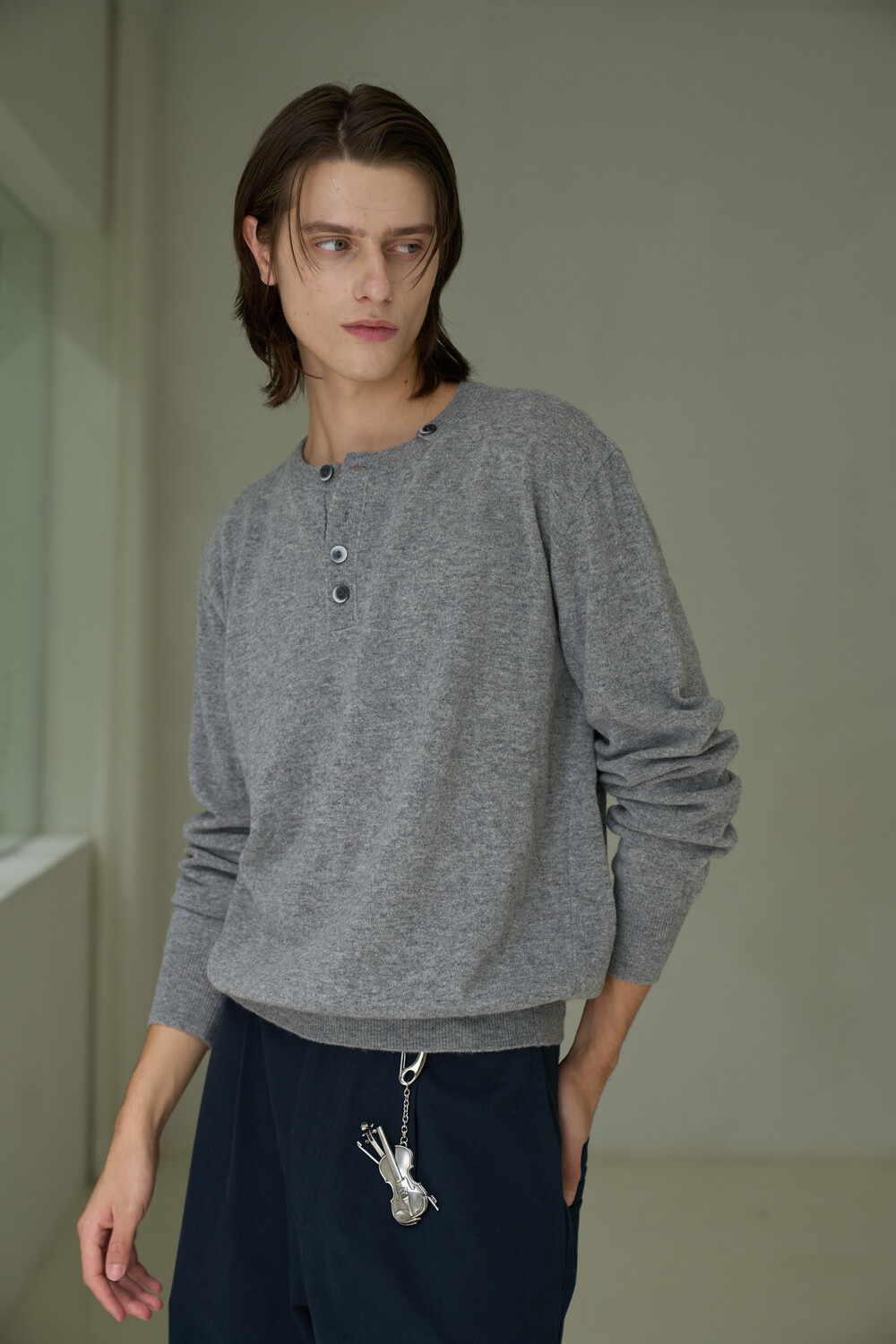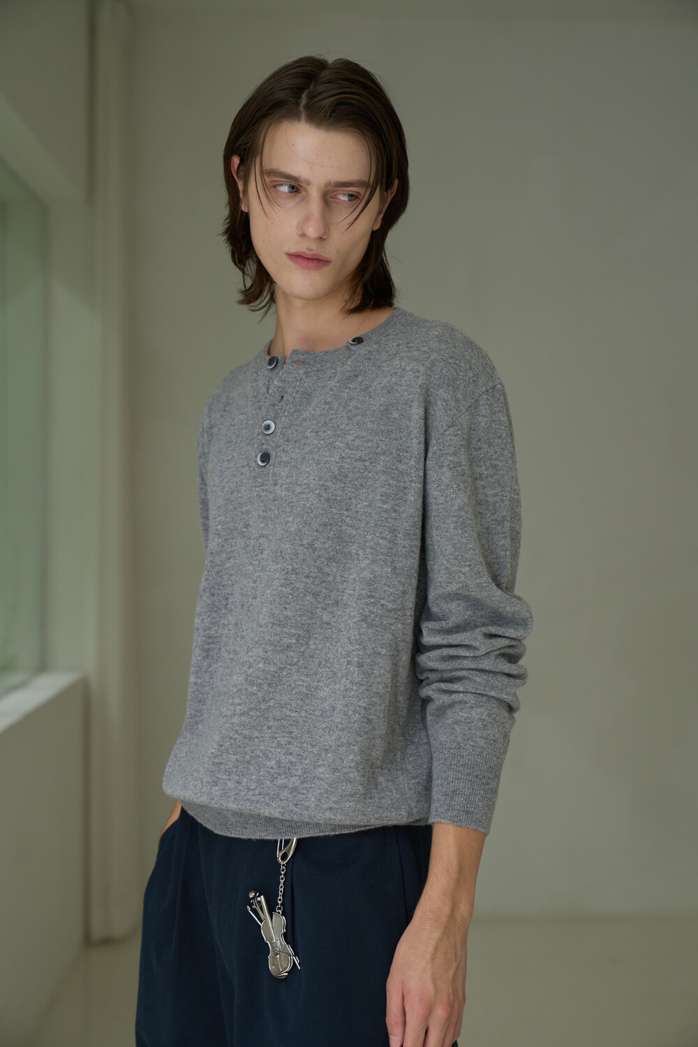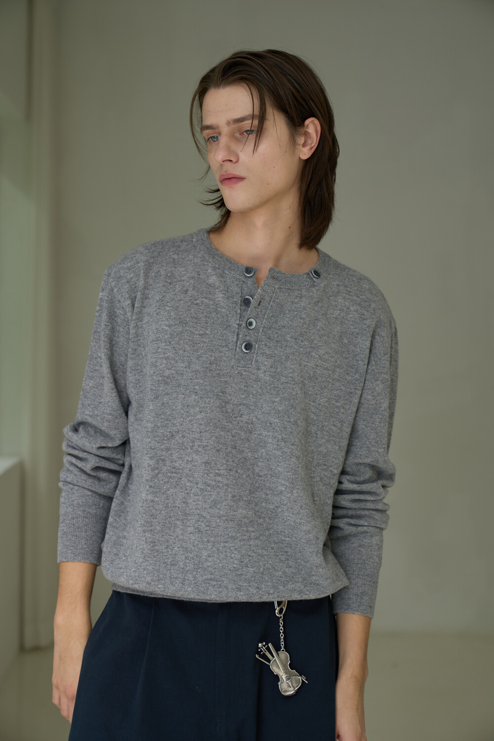 Button Pullover Henley-neck Knit - Grey