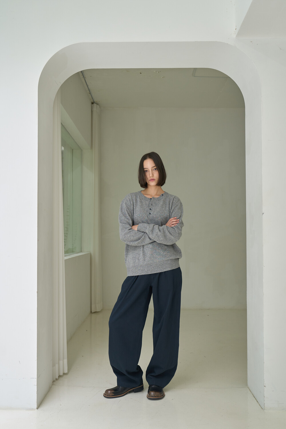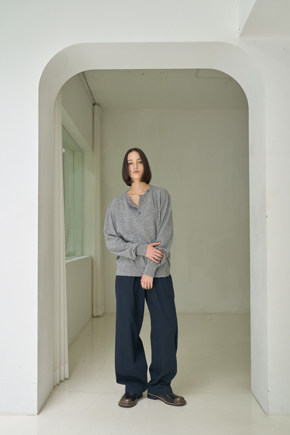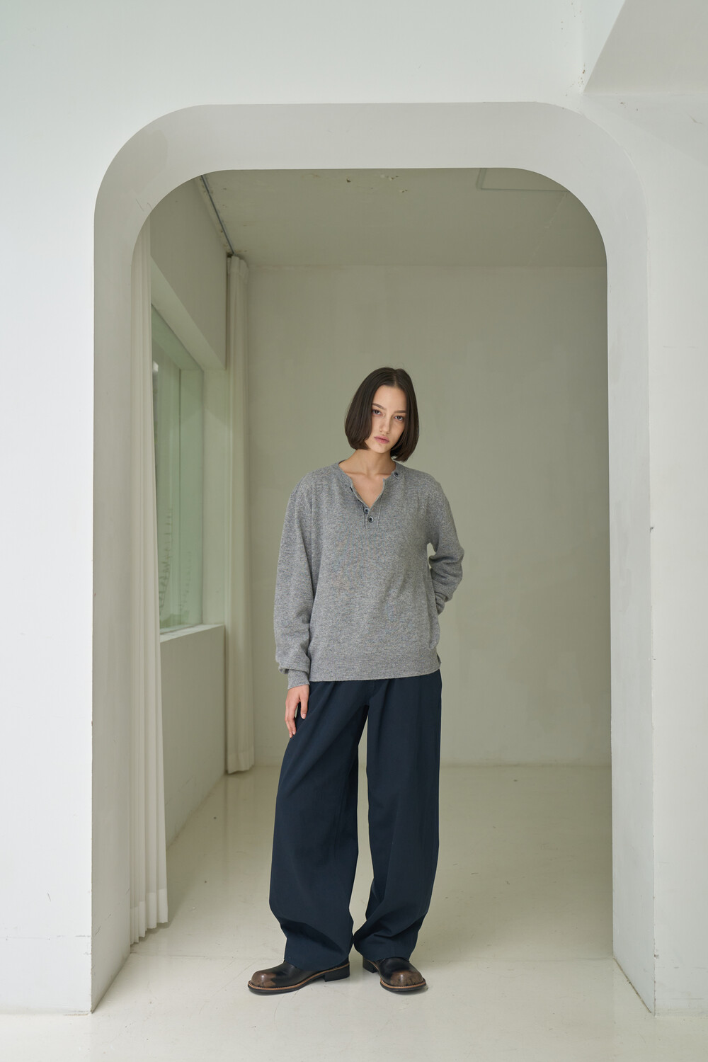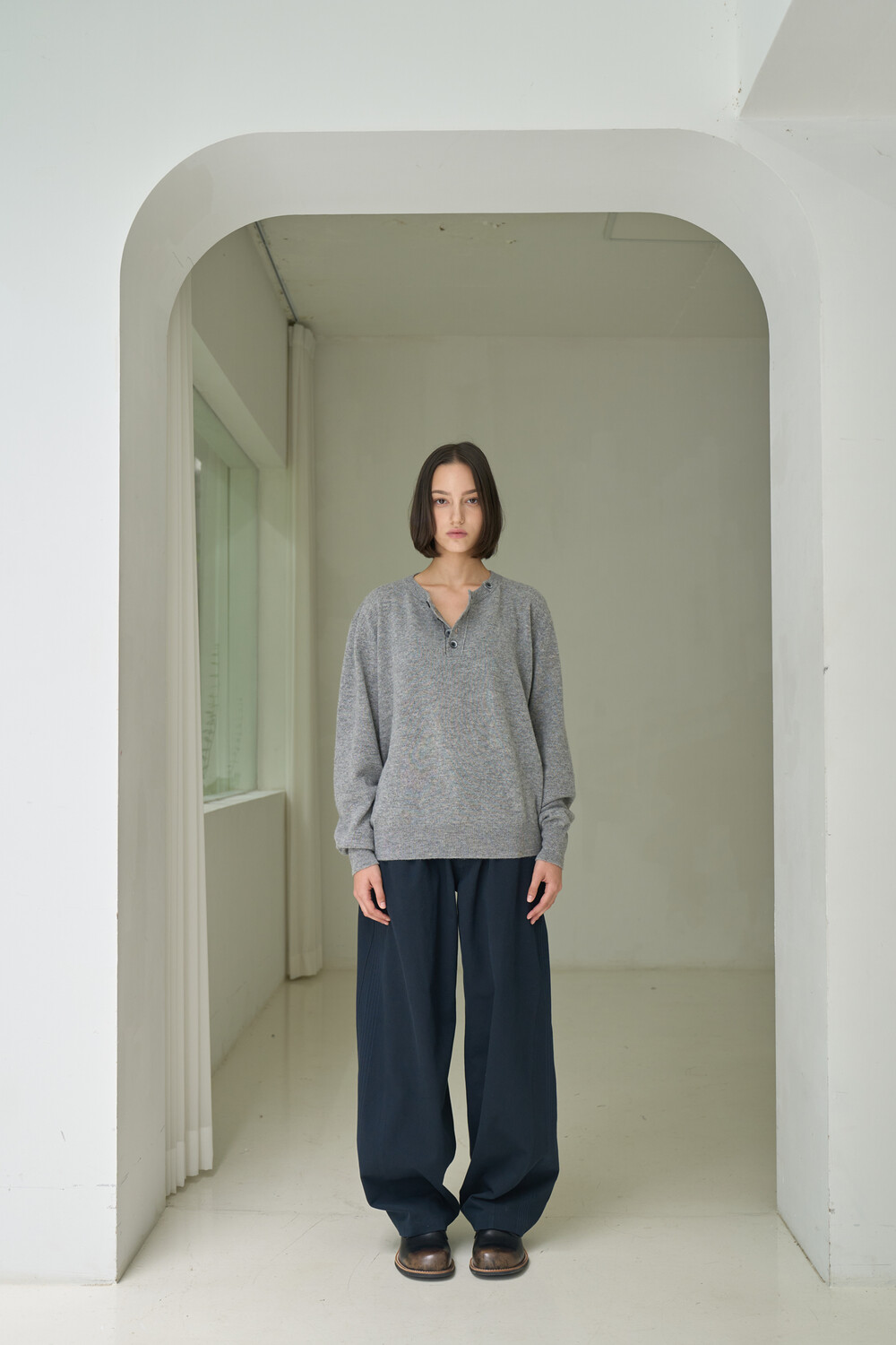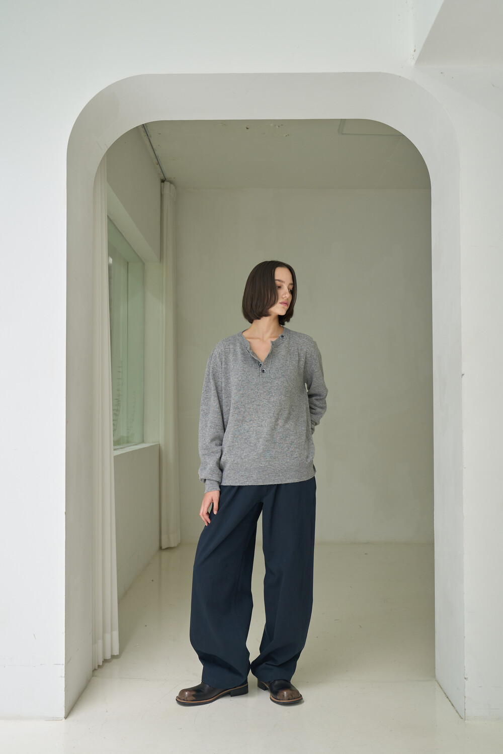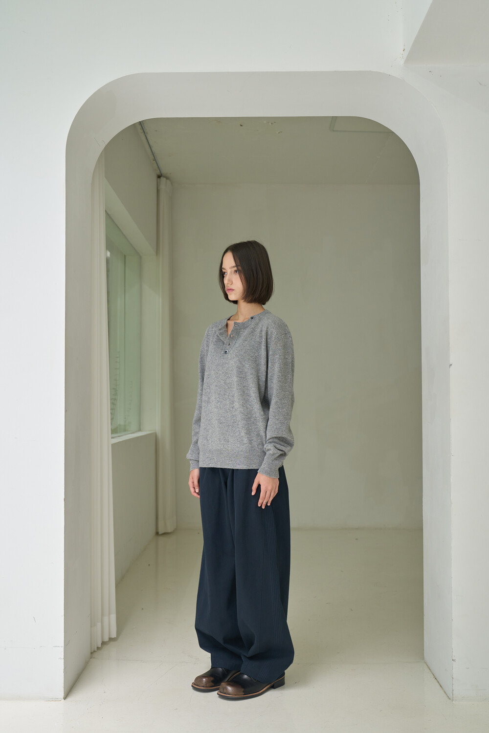 Button Pullover Henley-neck Knit - Grey