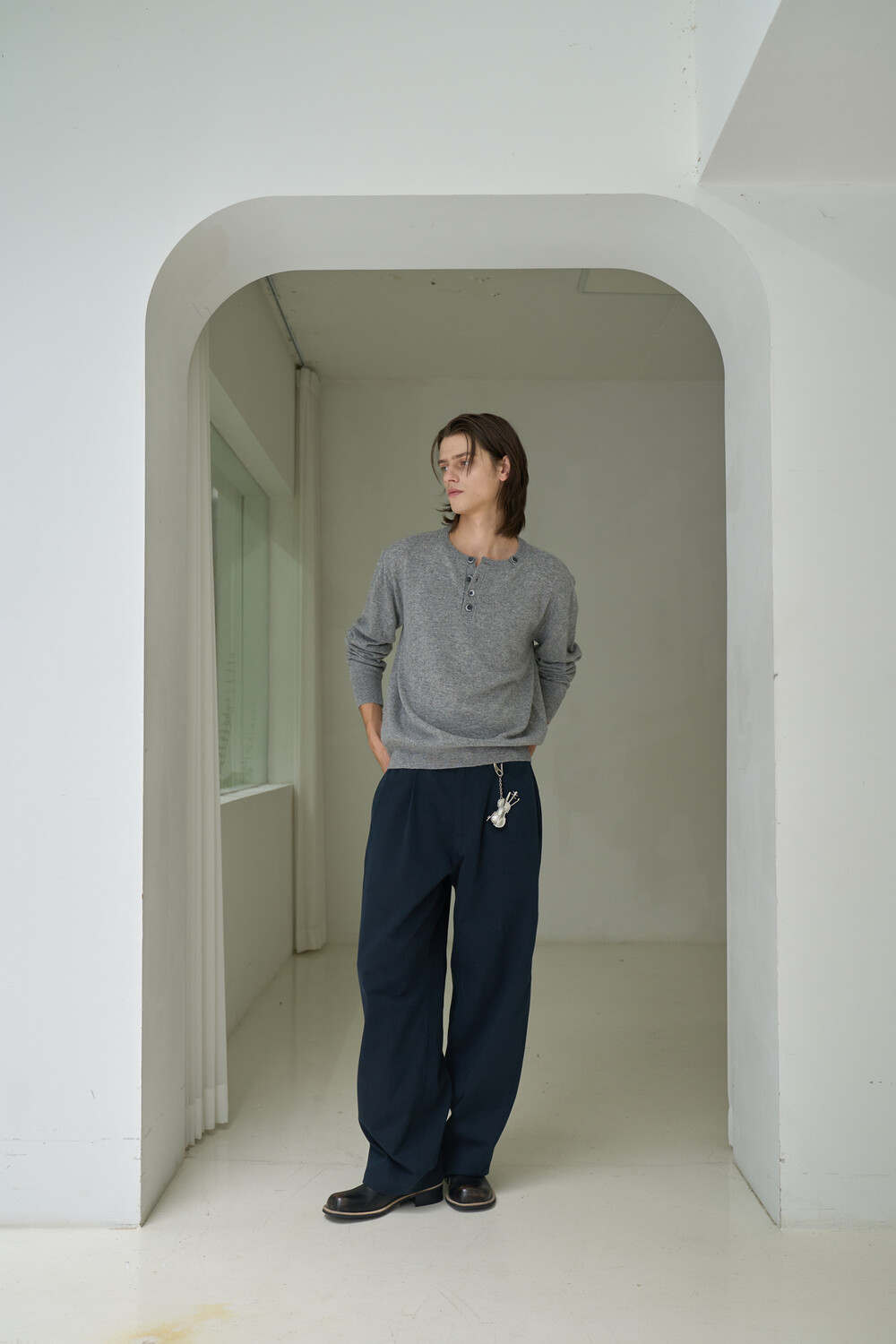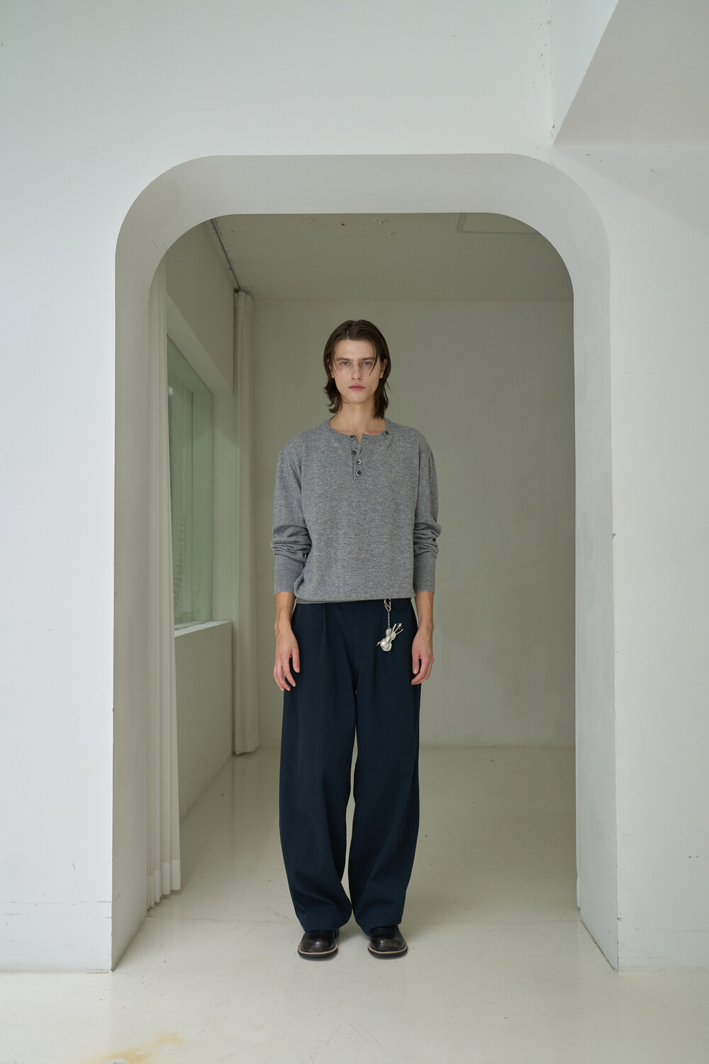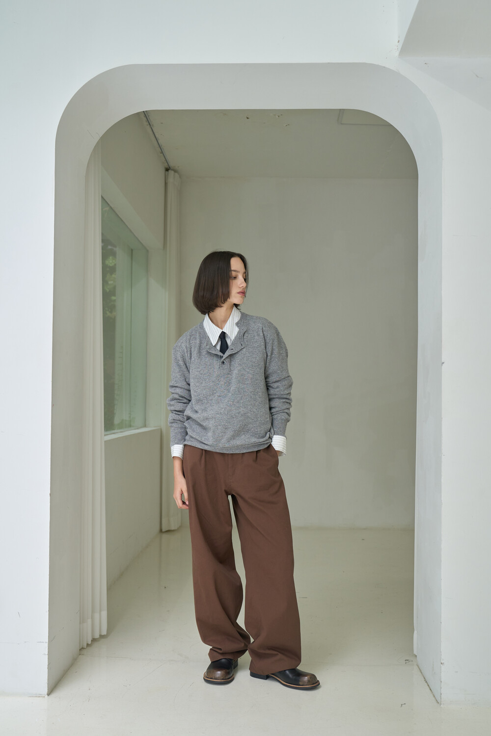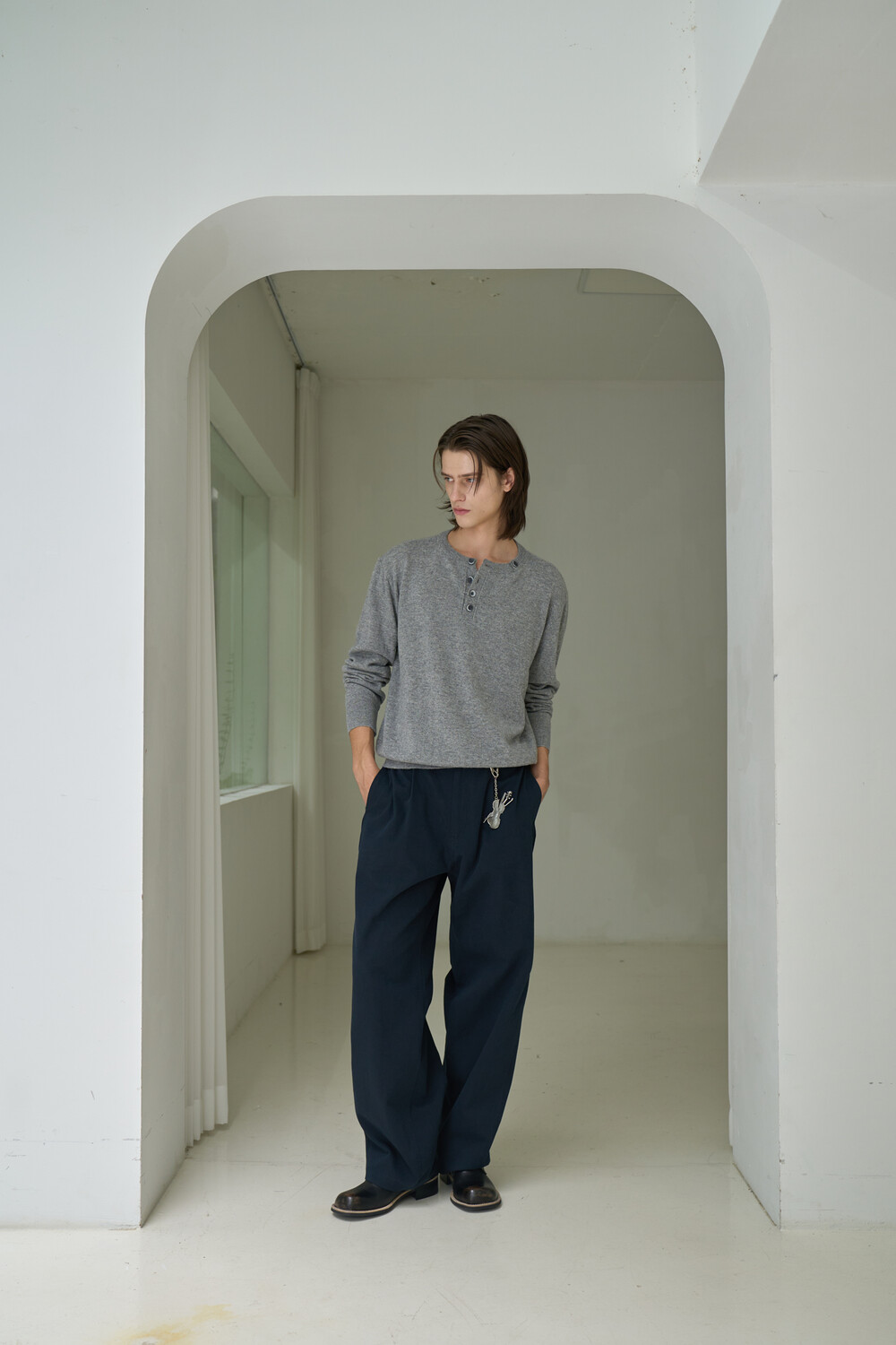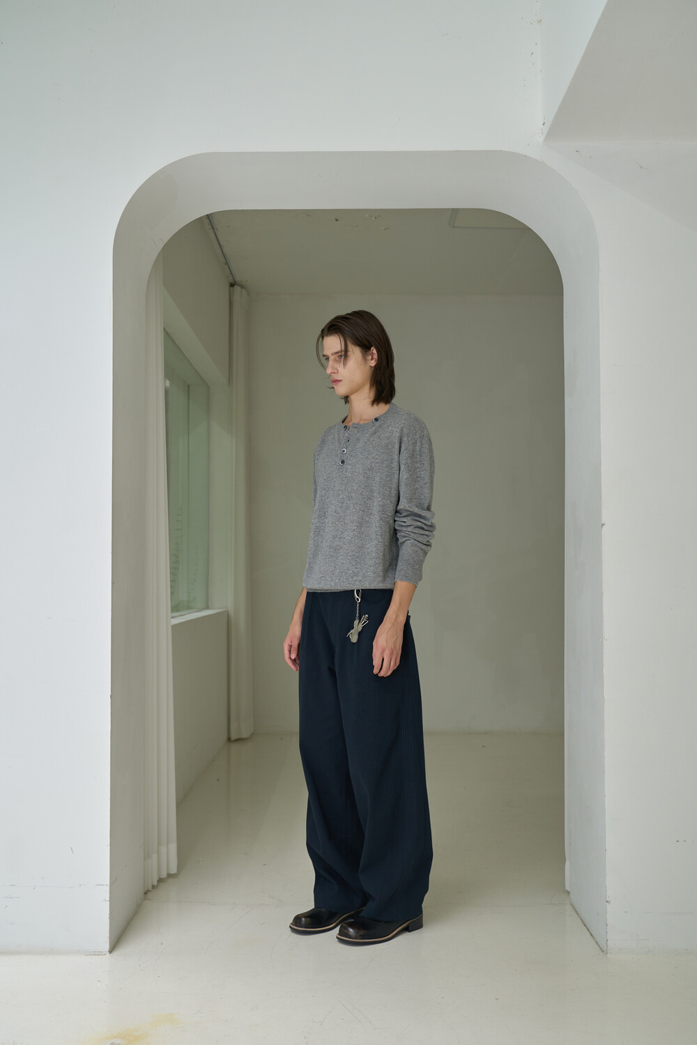 Button Pullover Henley-neck Knit - Grey