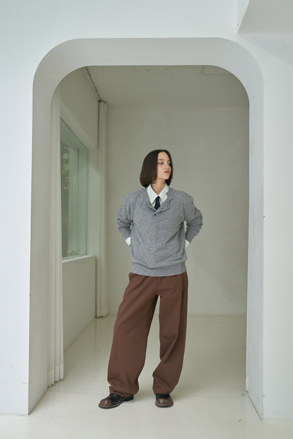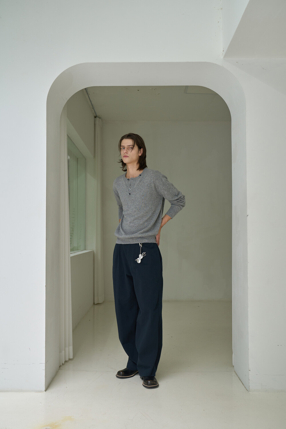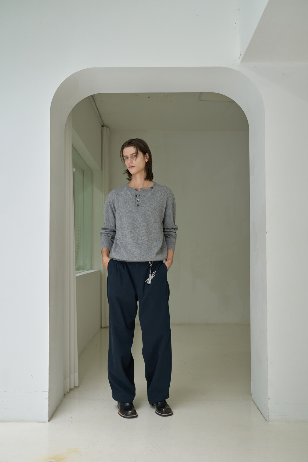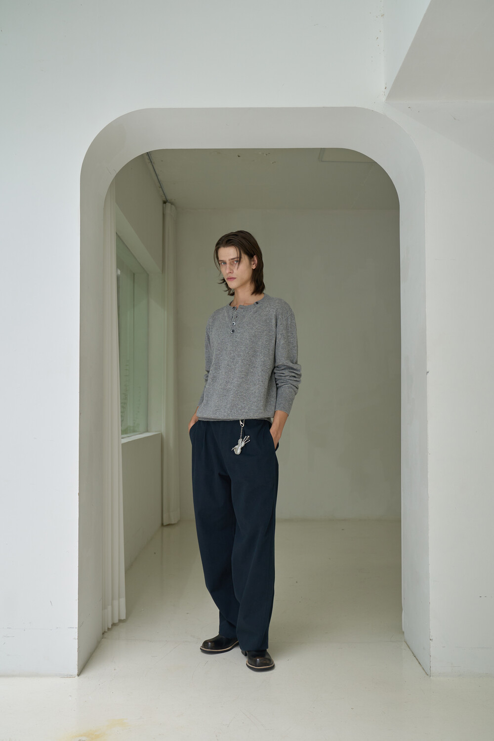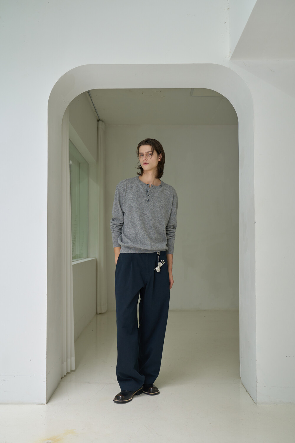 Button Pullover Henley-neck Knit - Grey