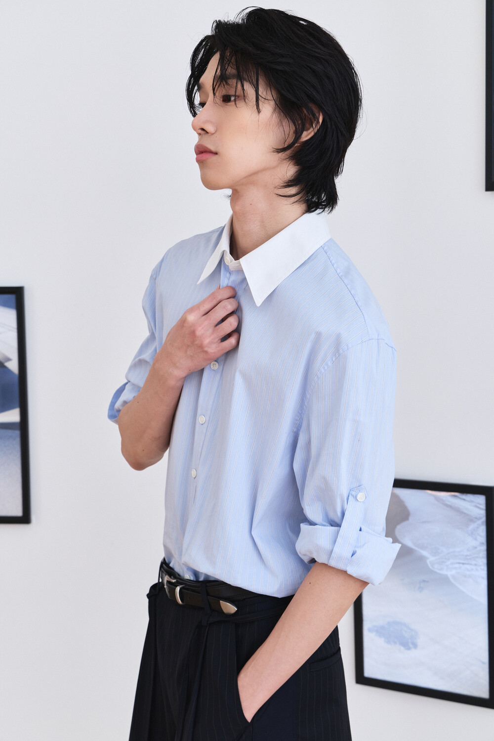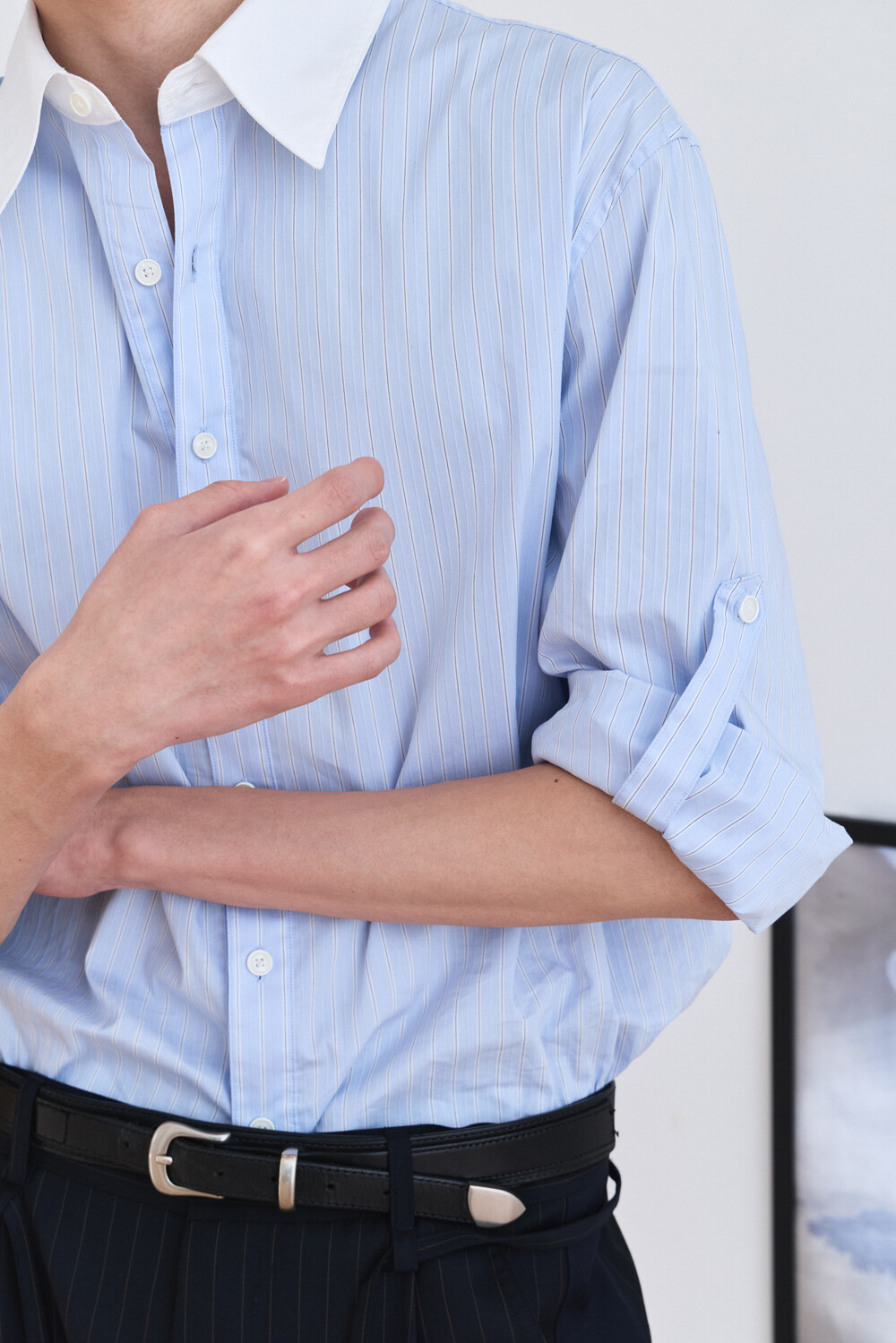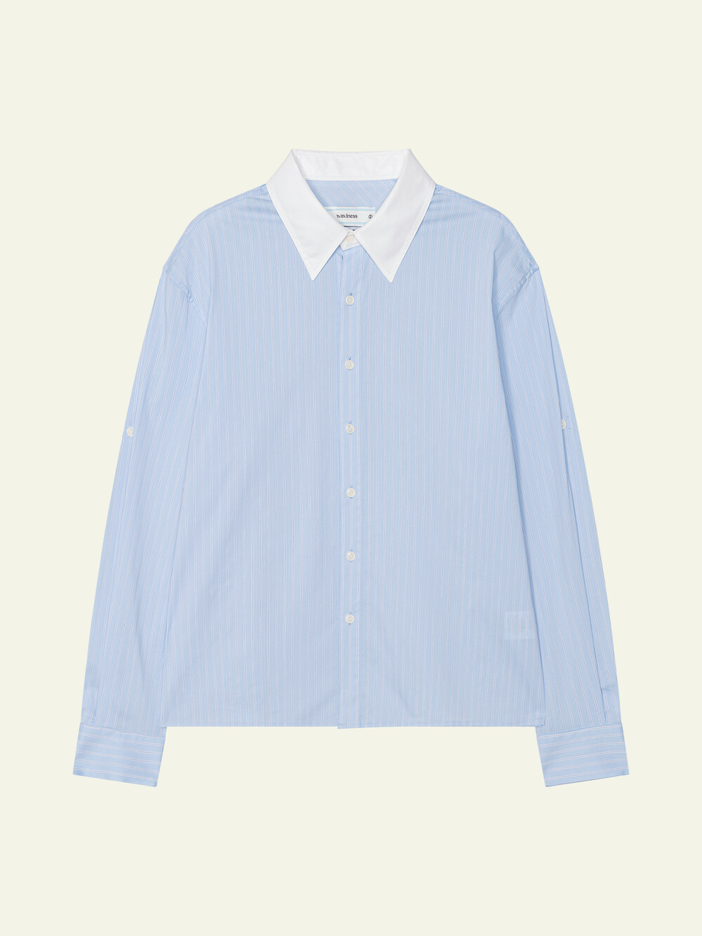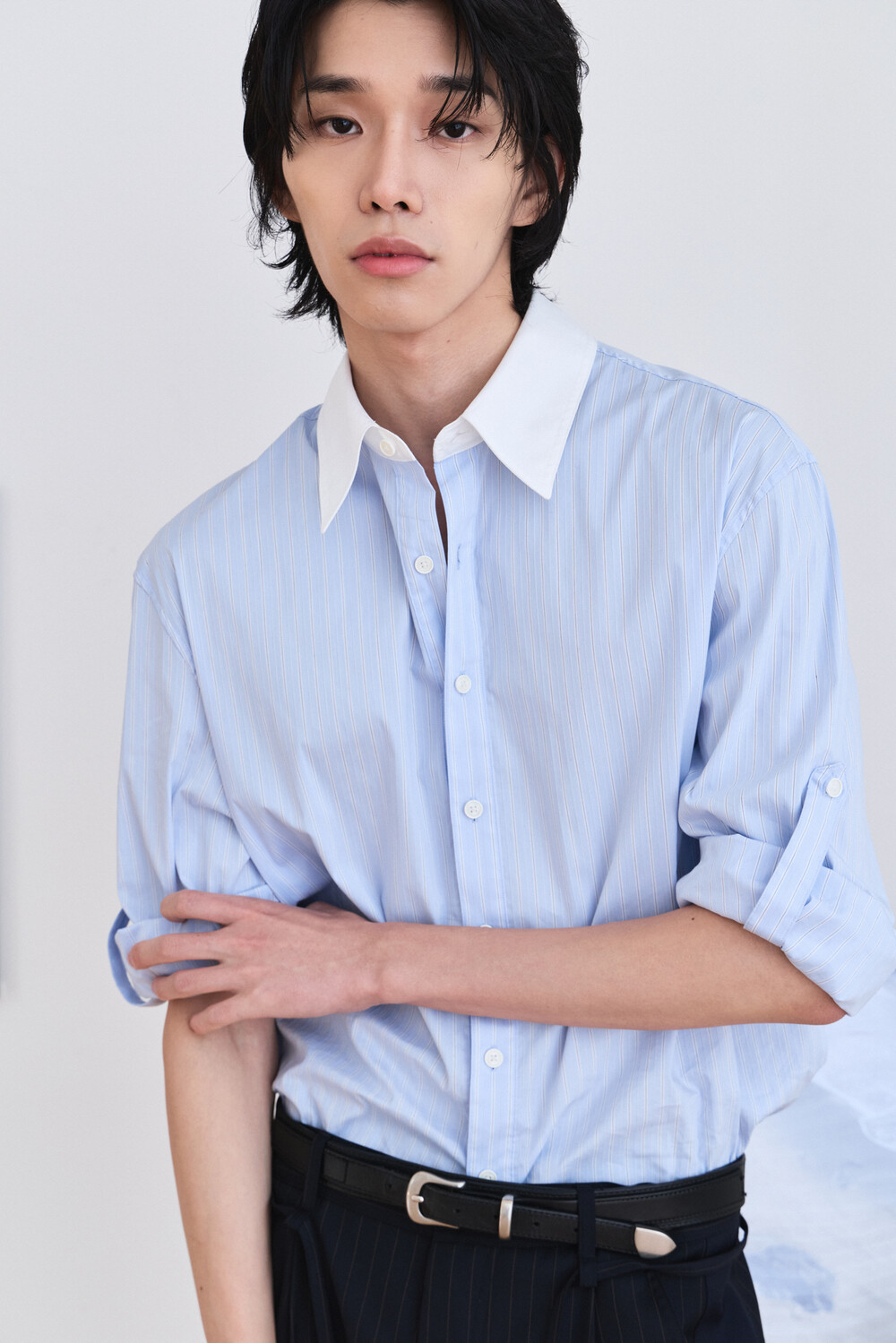 [ x HELET] Cleric Collar Stripe Shirts - Pastel Blue