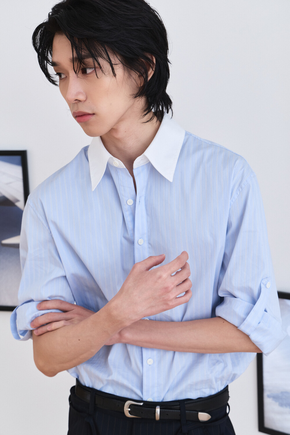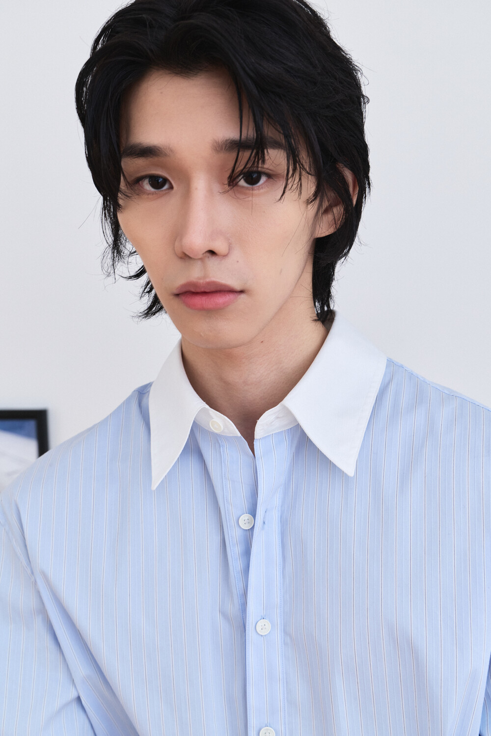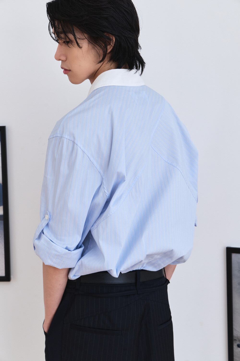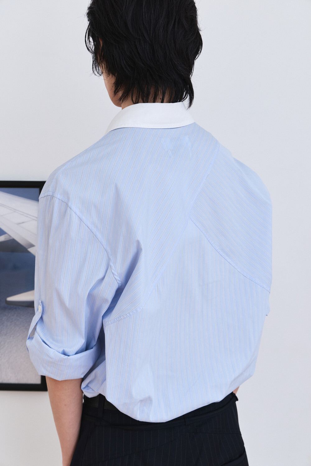 [ x HELET] Cleric Collar Stripe Shirts - Pastel Blue