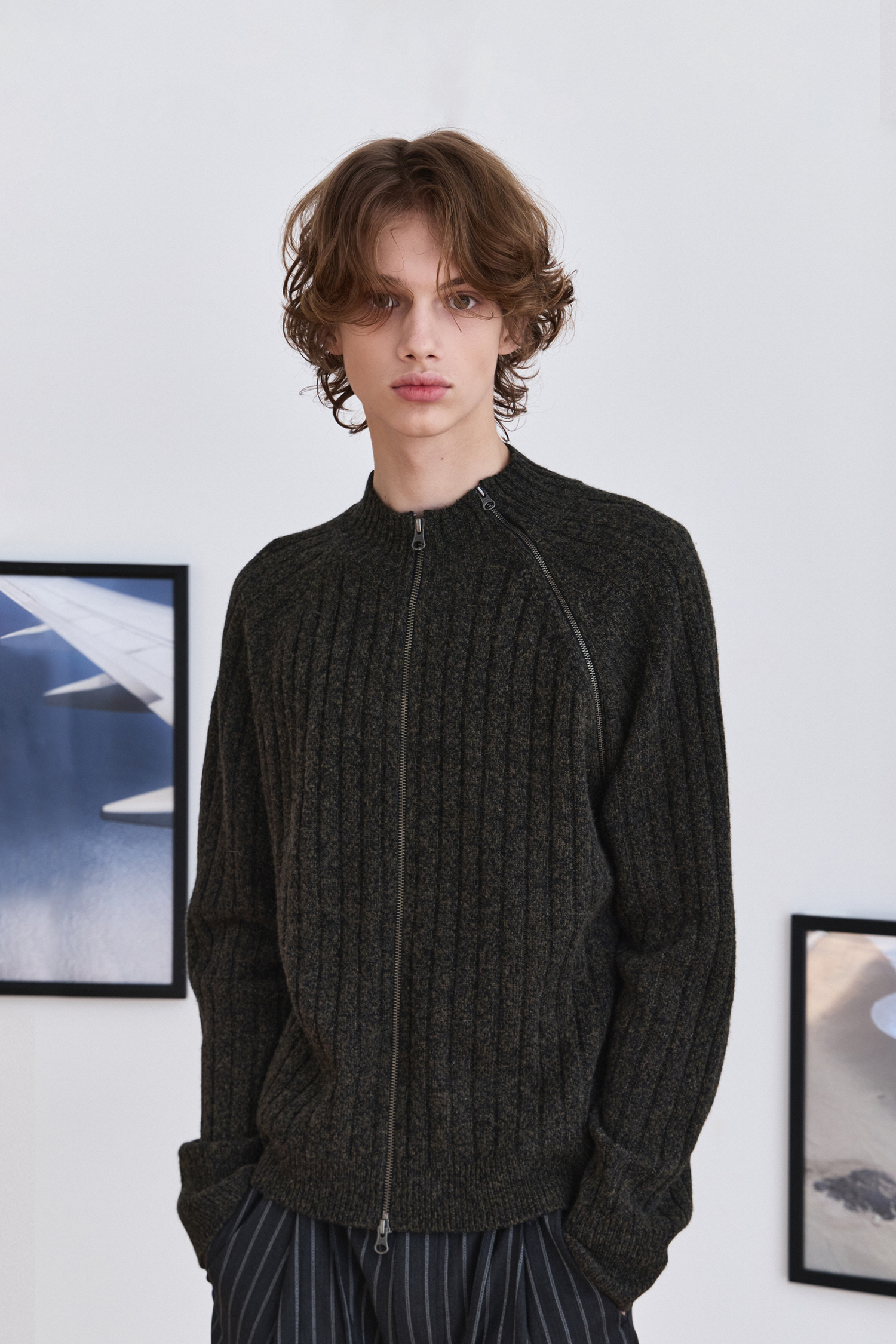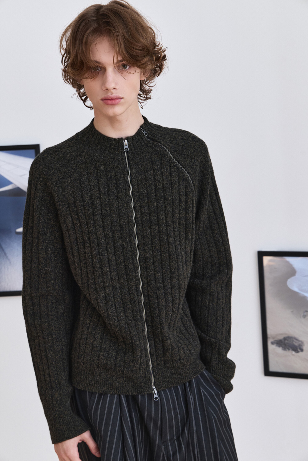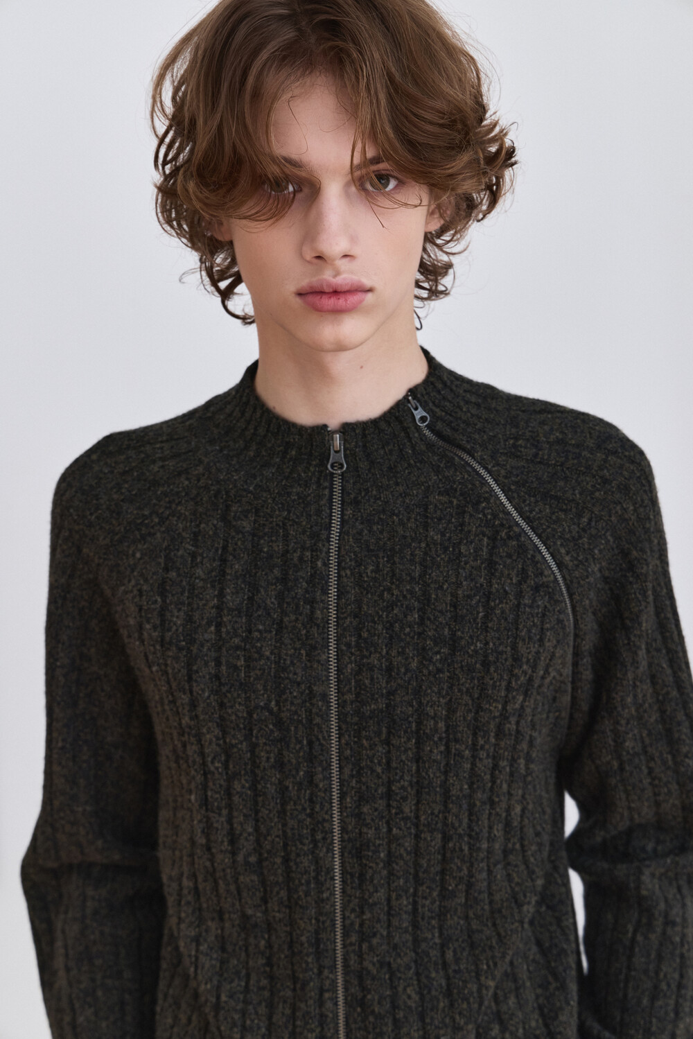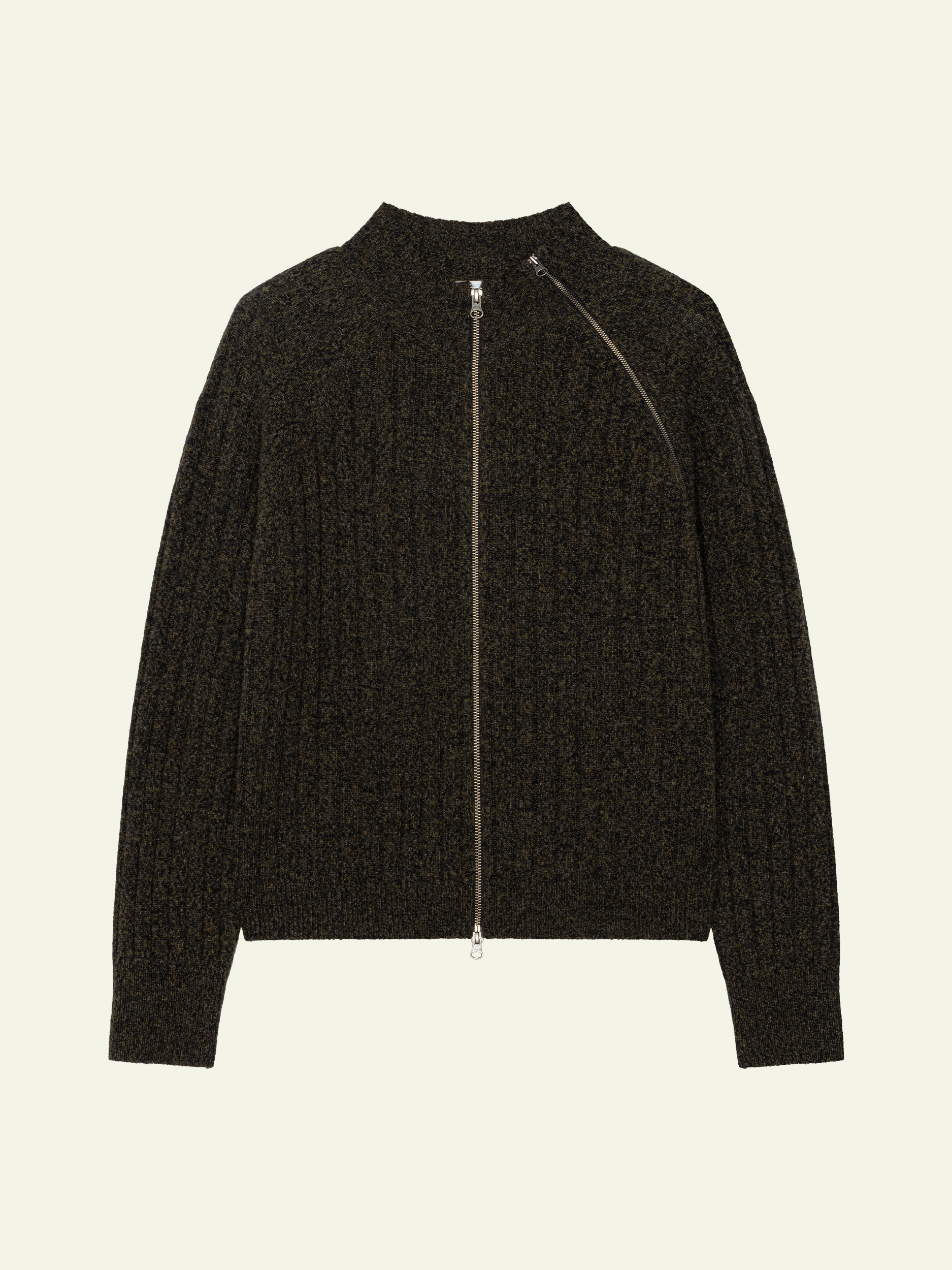 Diagonal Full Zip Up Knitwear - Khaki Green