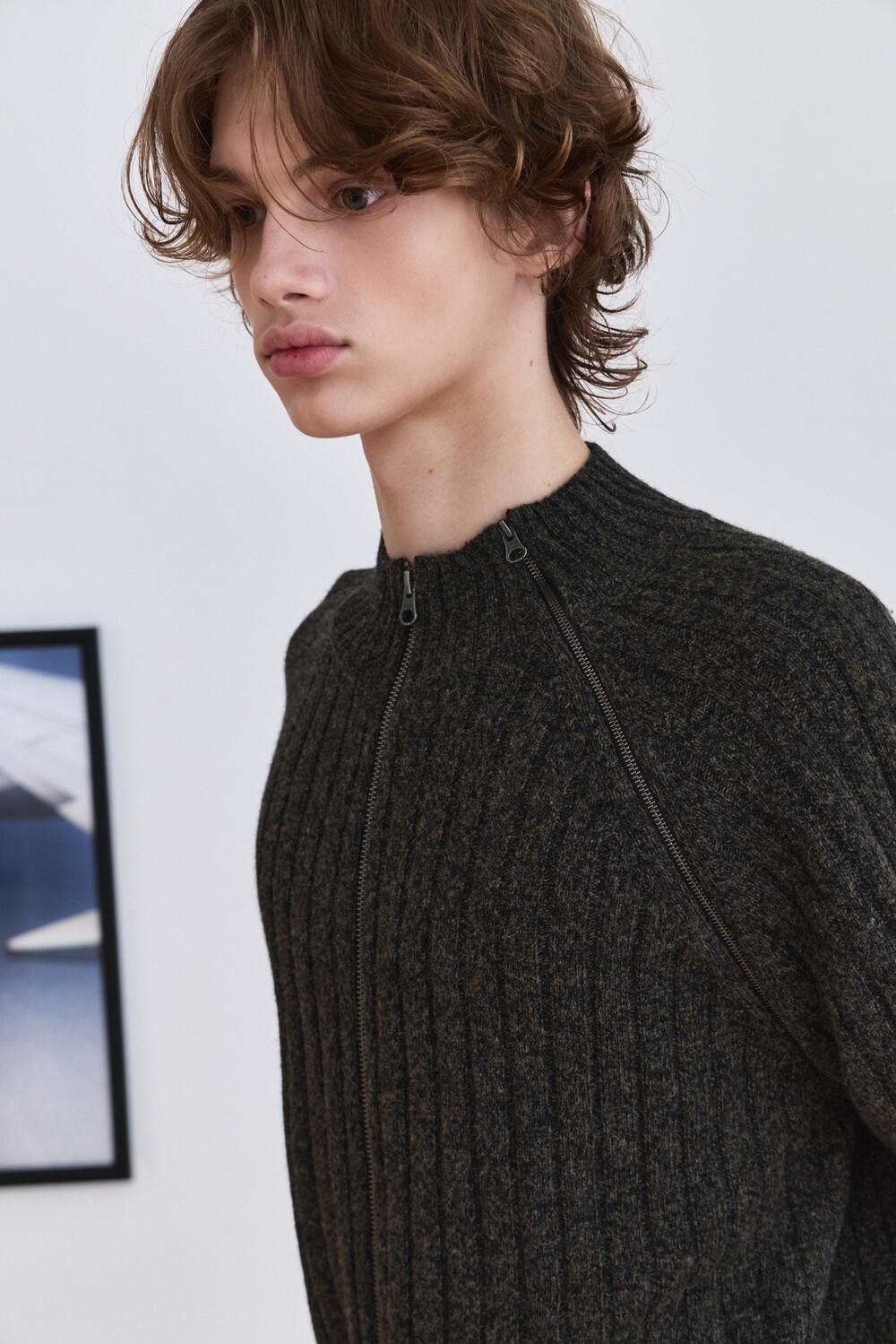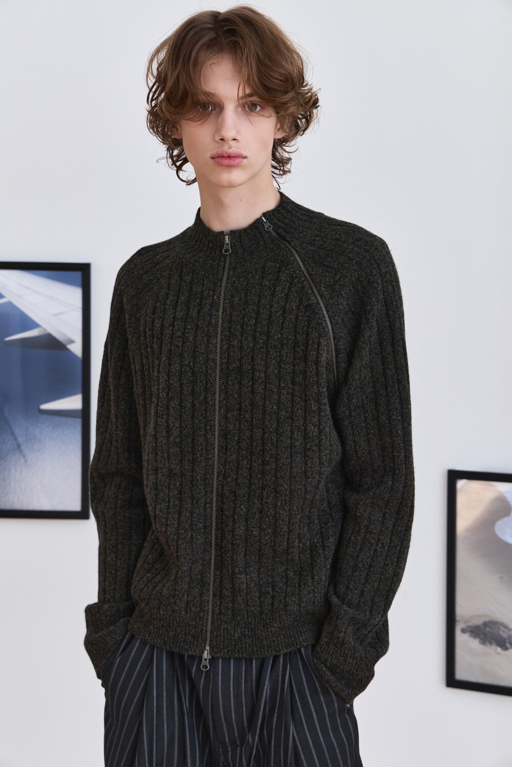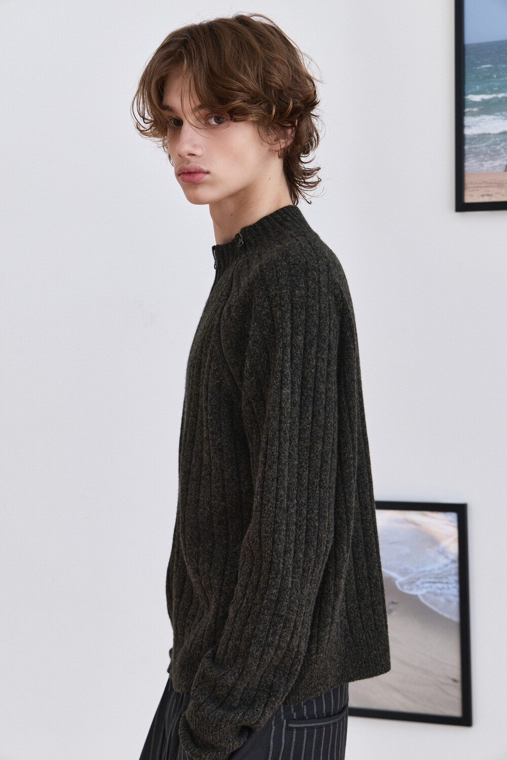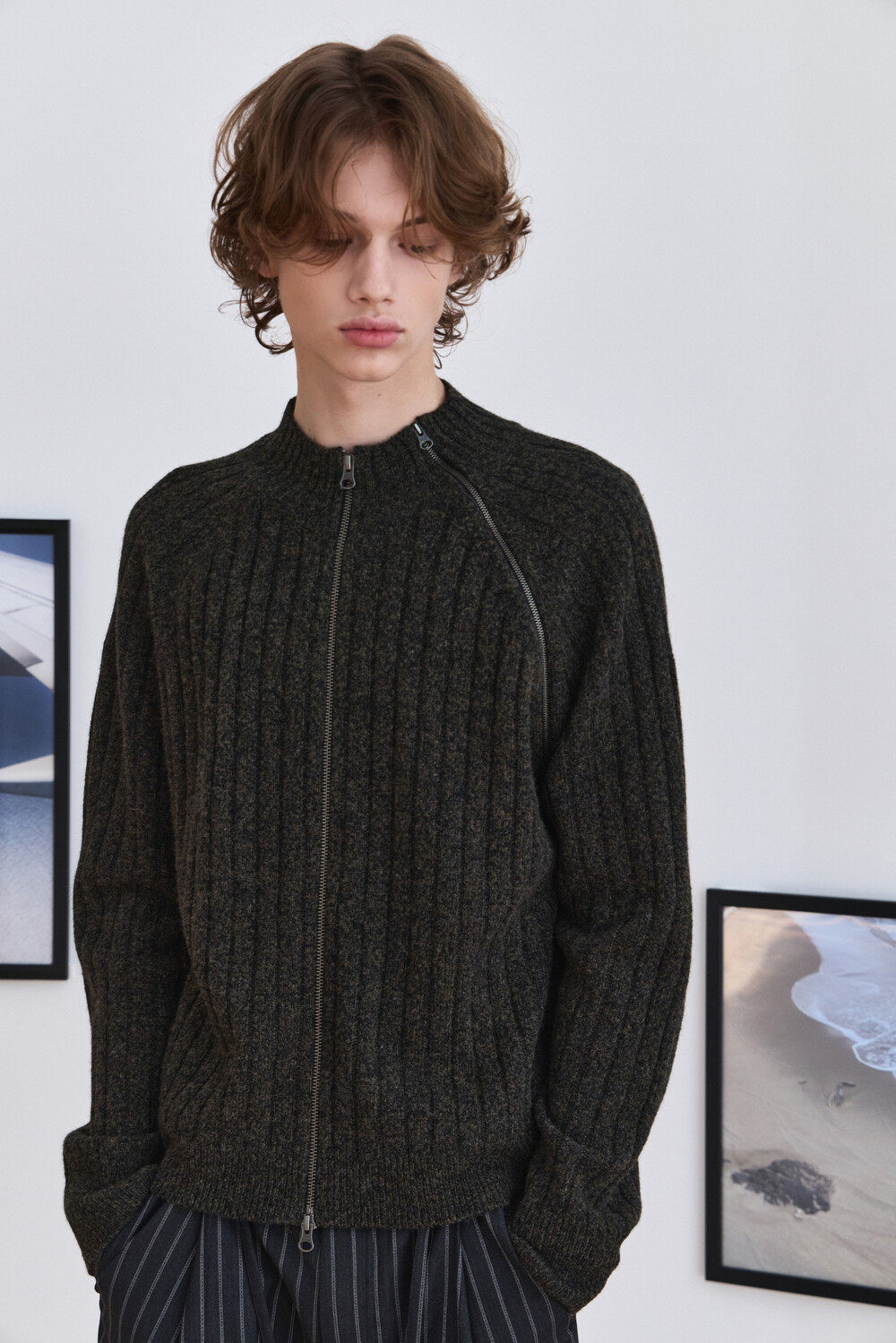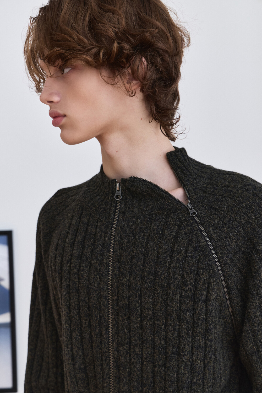 Diagonal Full Zip Up Knitwear - Khaki Green