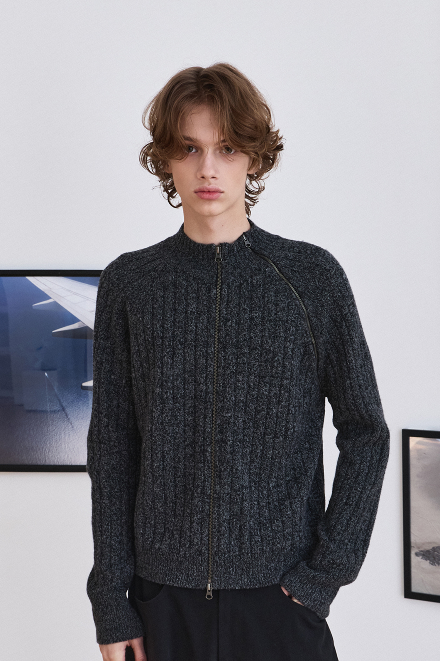 Diagonal Full Zip Up Knitwear - Melange Grey
