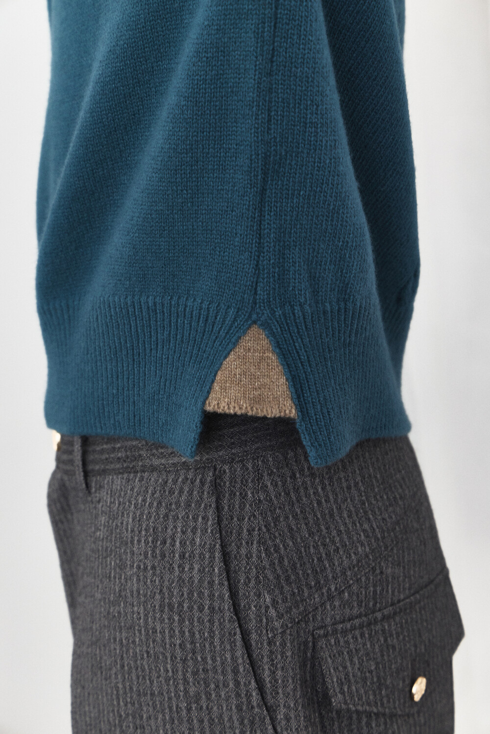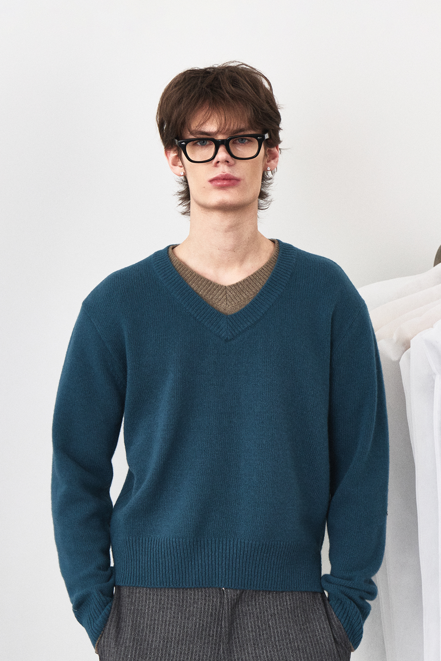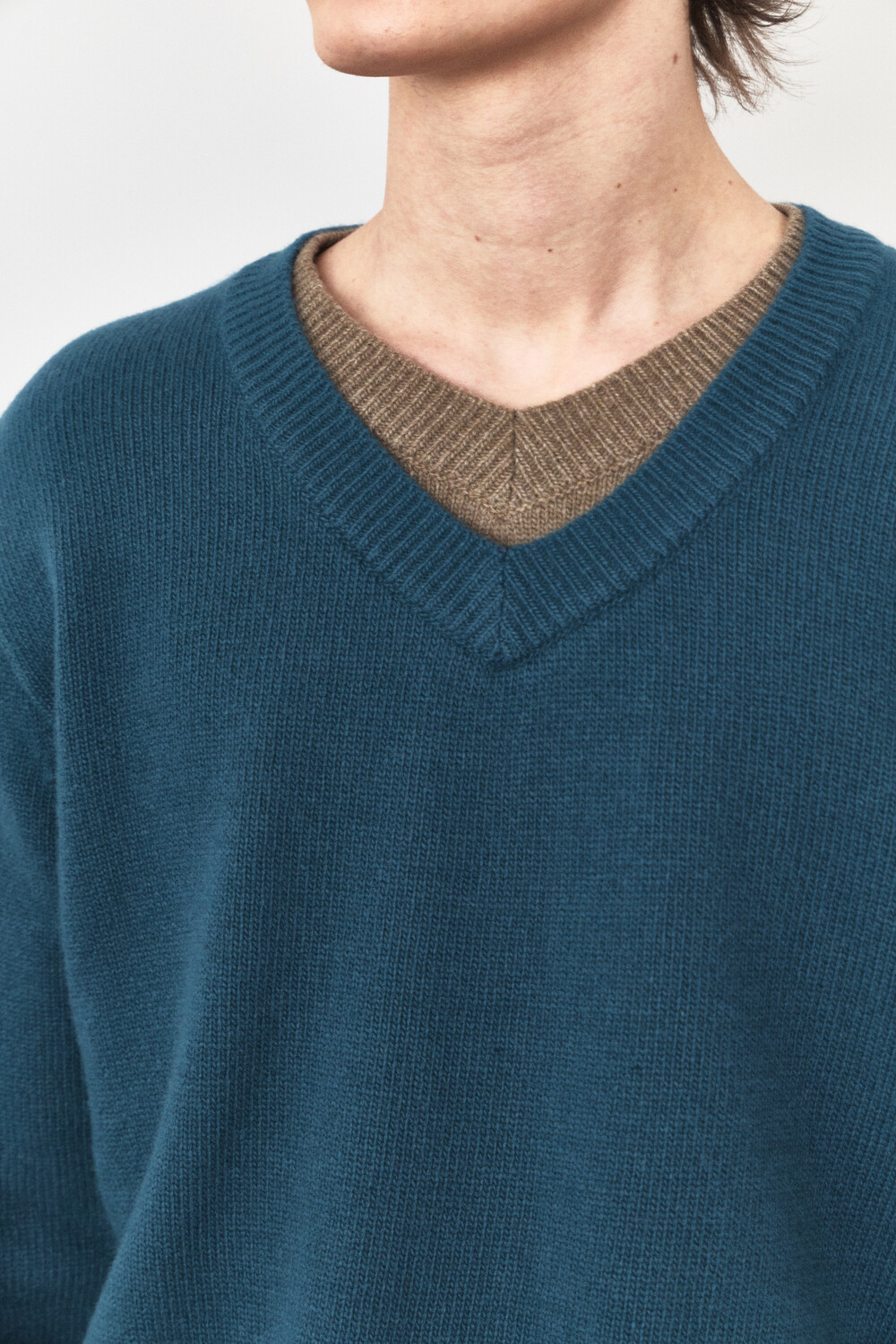 Double Layered V-Neck Knit - Turquoise Brown