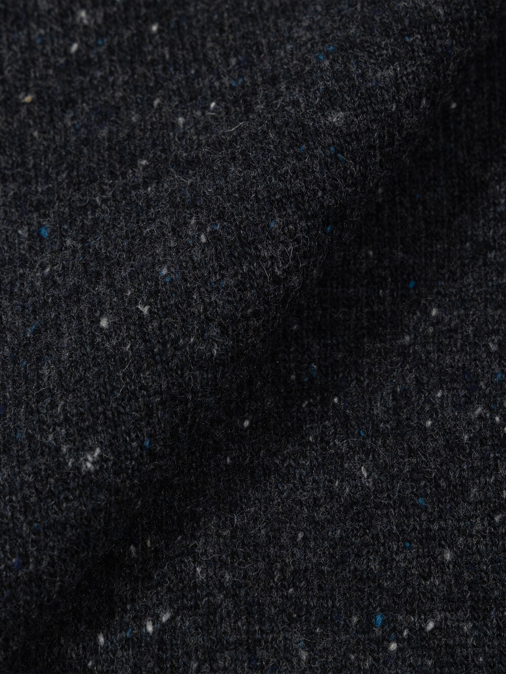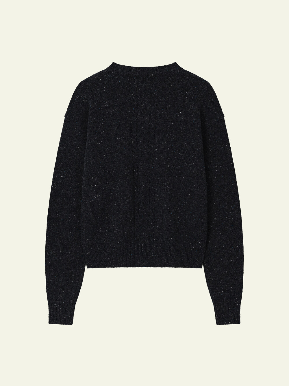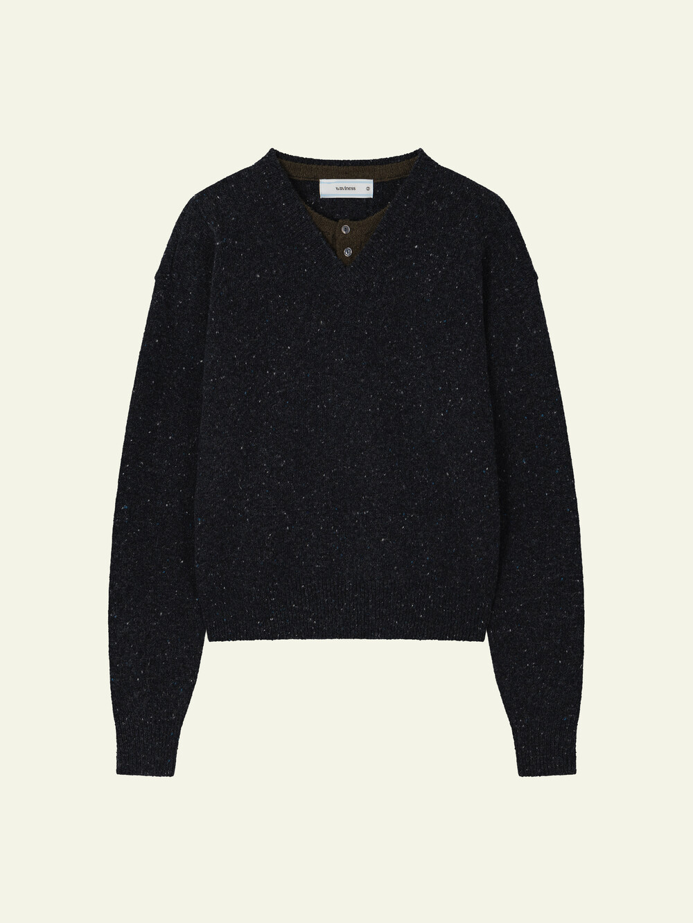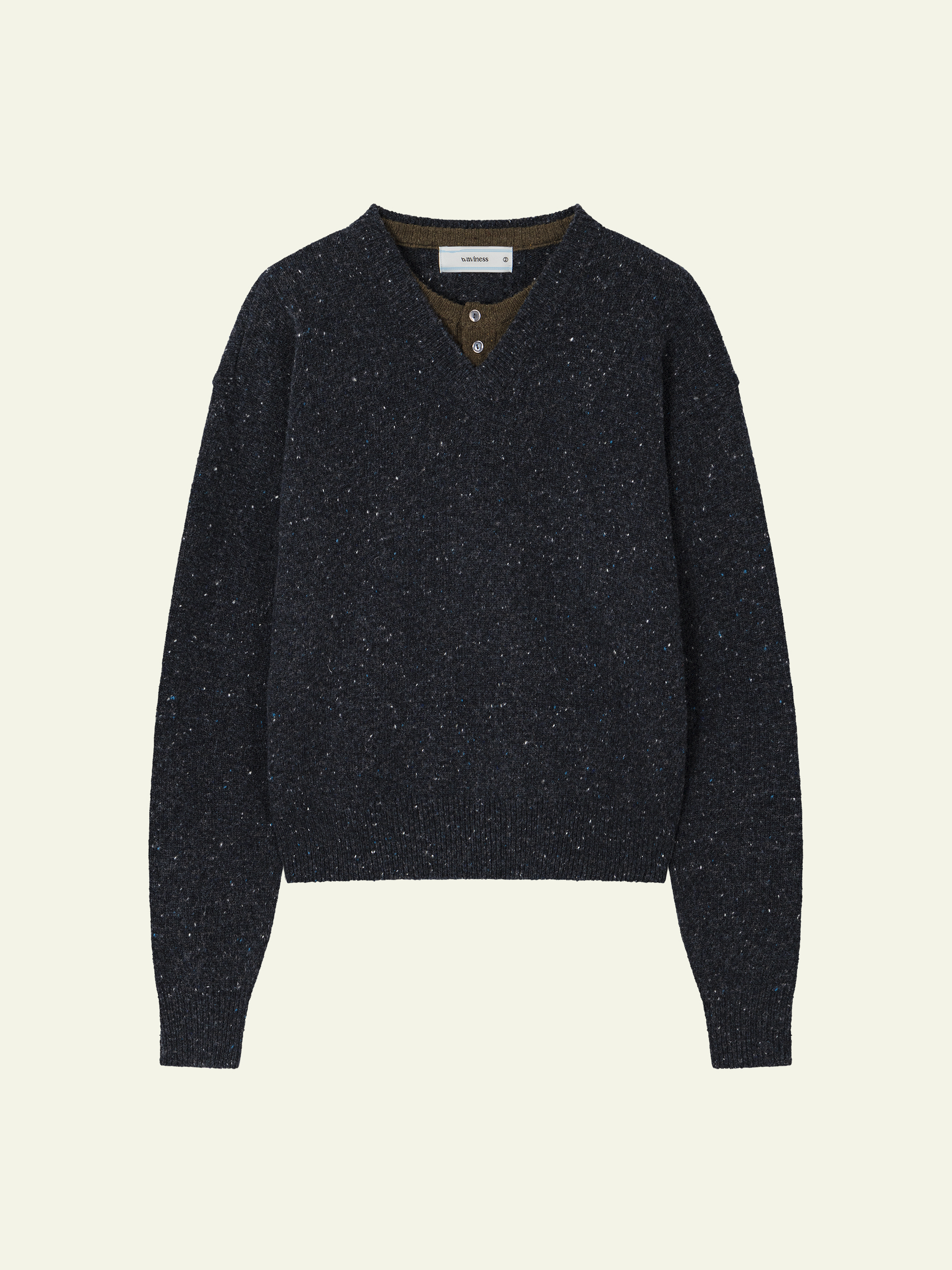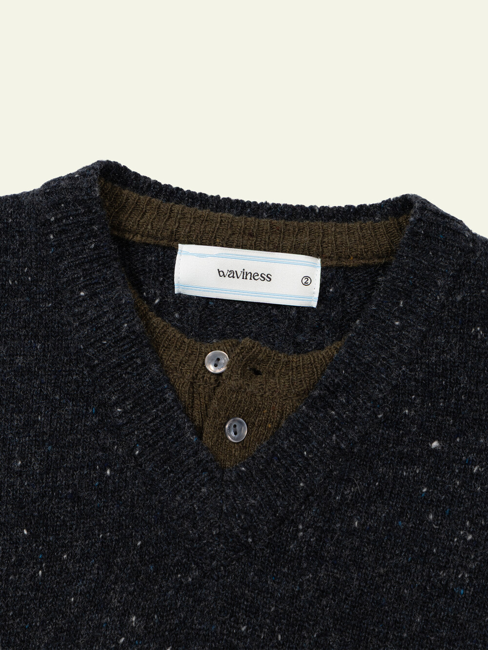 - 울 혼용 니트 패브릭으로 제작된 헨리넥 레이어드 브이넥 디자인 - 홀리데이 시즌에 걸맞는 패브릭 - 후면부 웨이비니스 시그니처 디테일 - 헨리넥과 브이넥을 레이어드해 입은 디자인 - 웨이비니스 로고 각인 단추