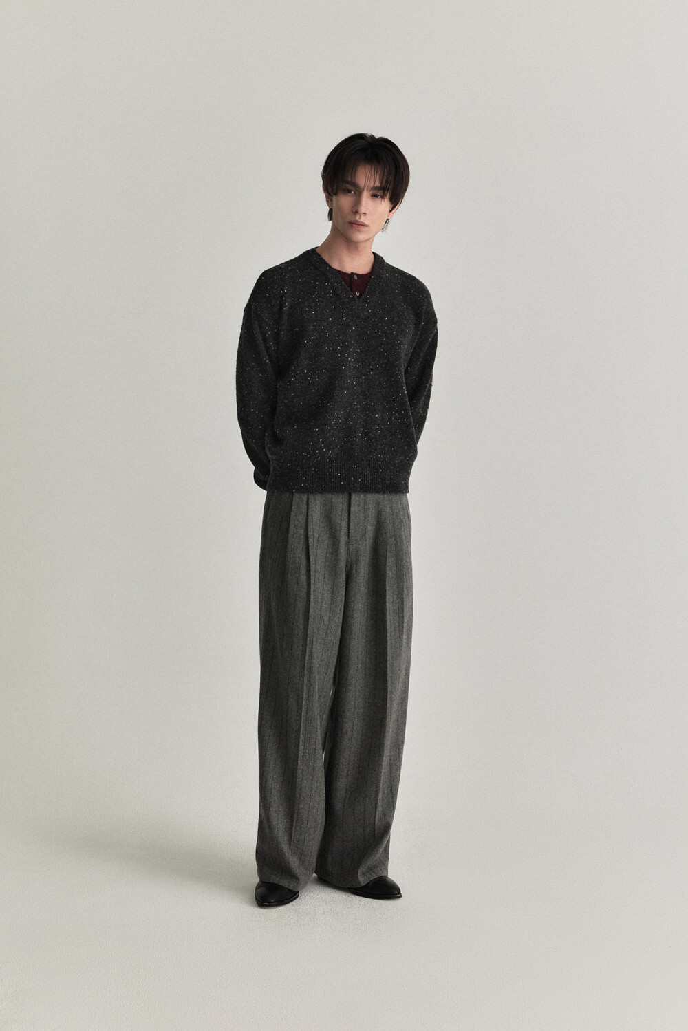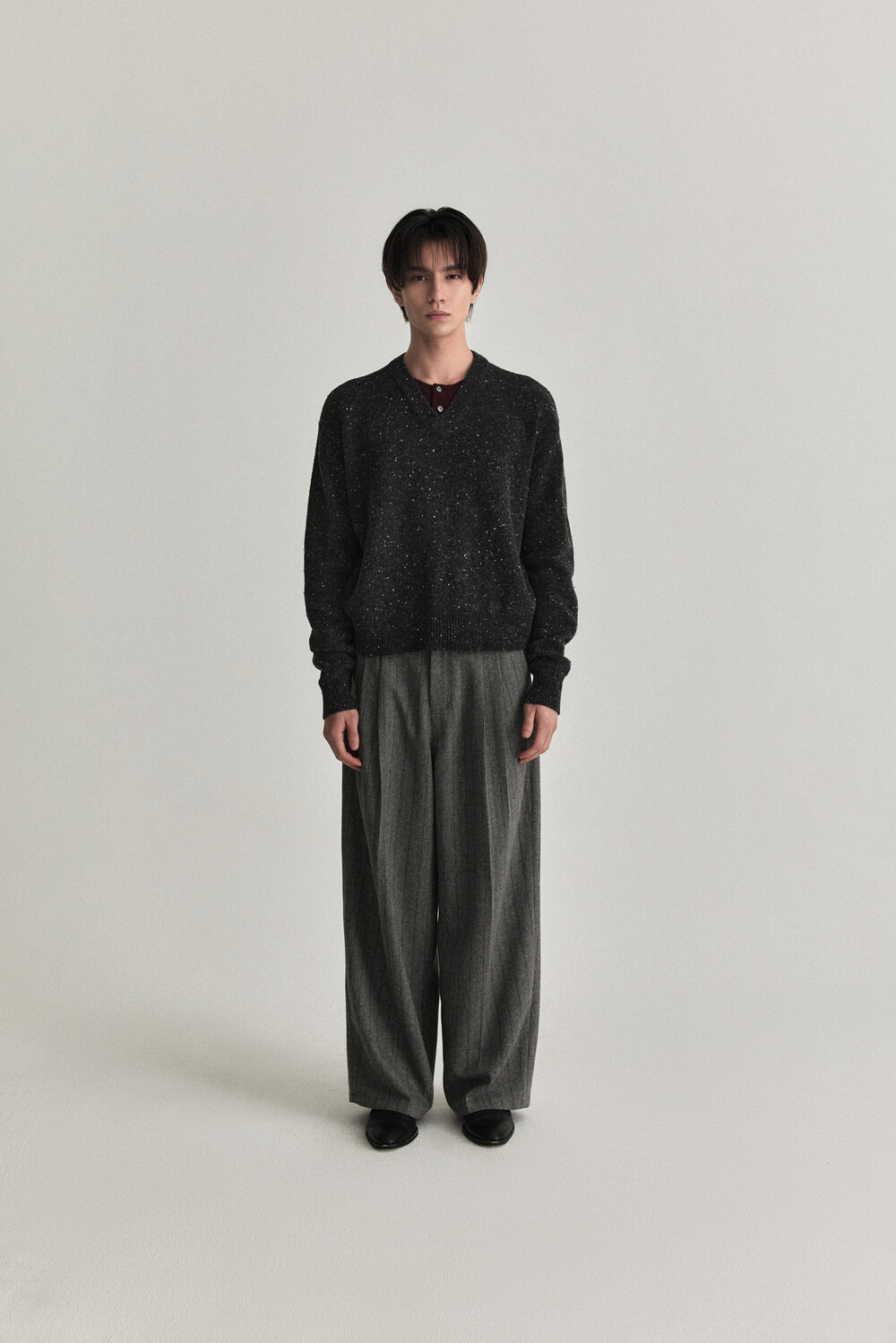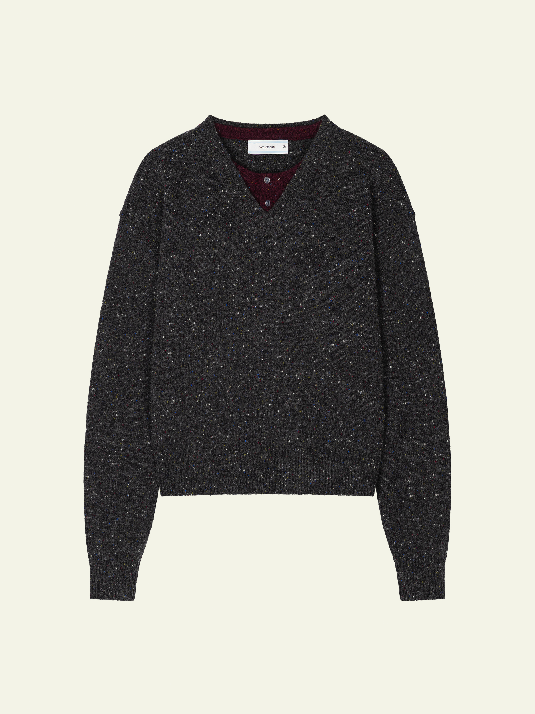 - 울 혼용 니트 패브릭으로 제작된 헨리넥 레이어드 브이넥 디자인