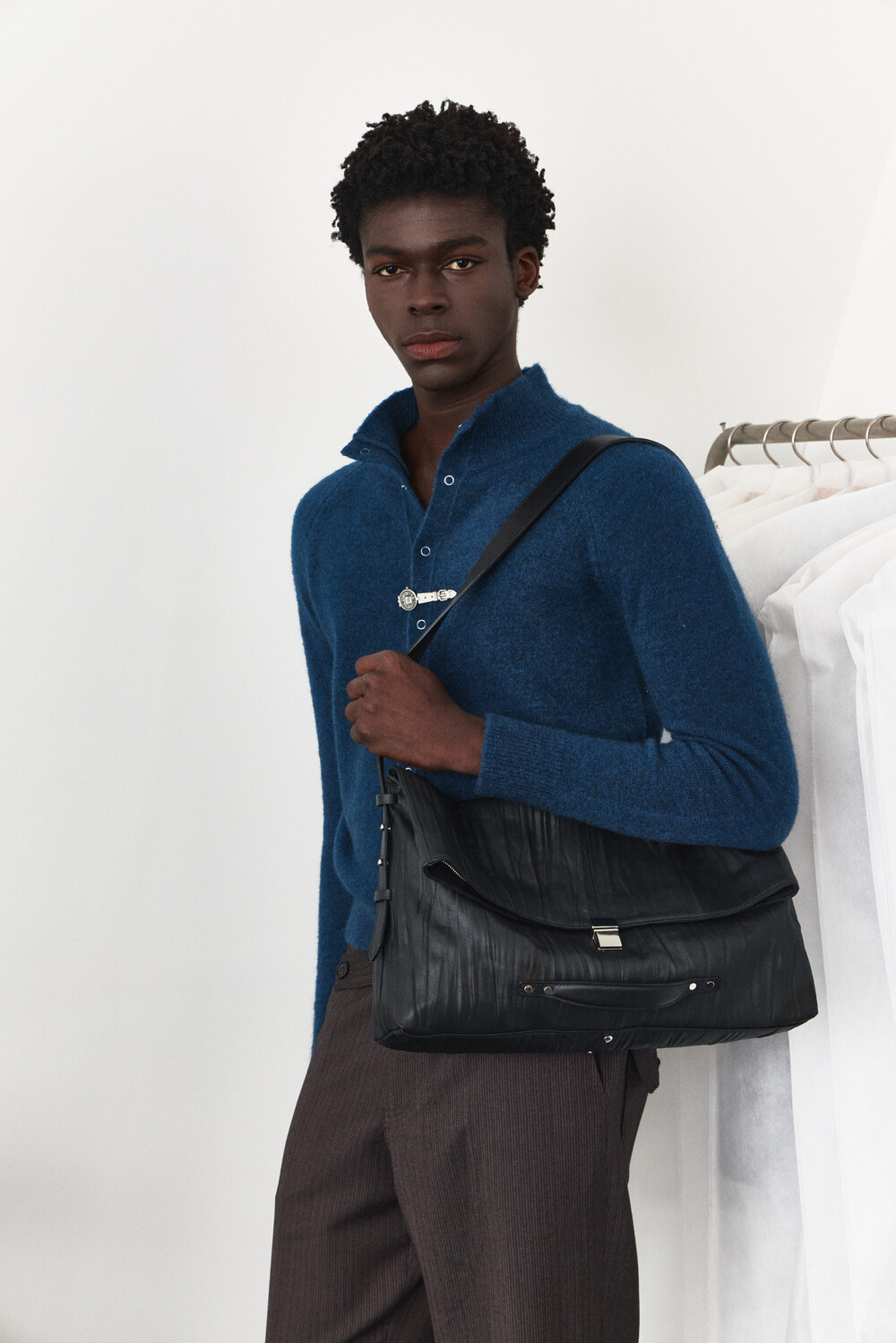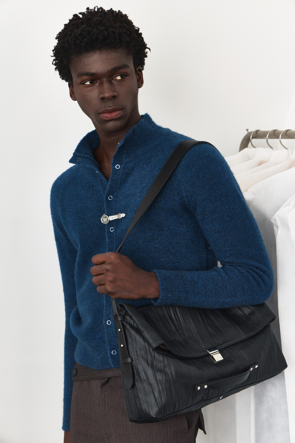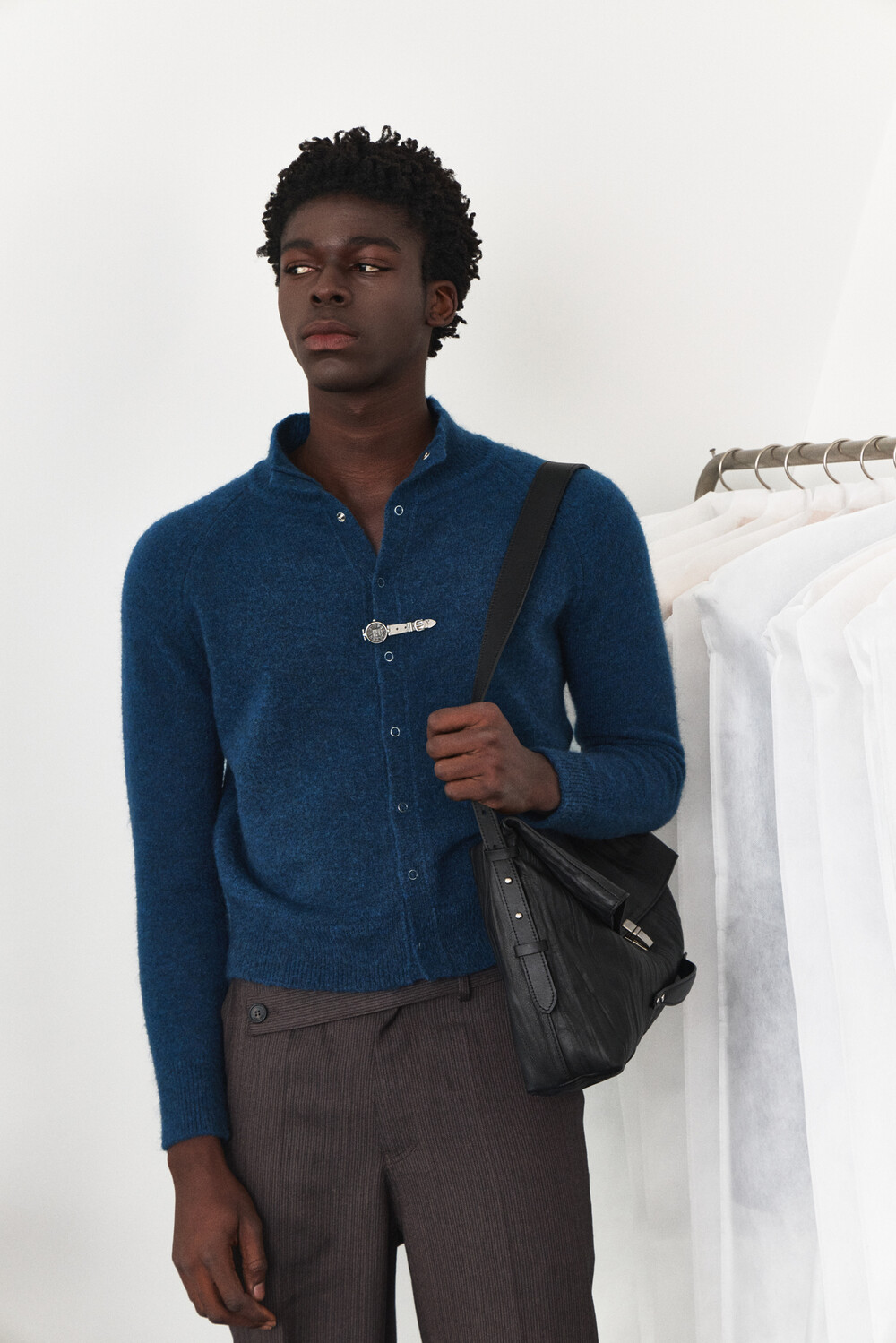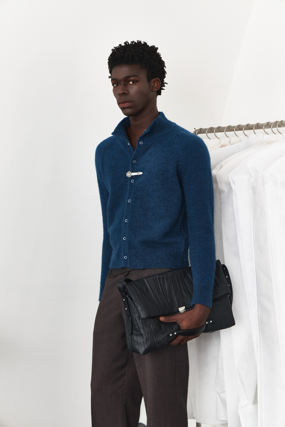 High-Neck Snap Mohair Cardigan - Blue