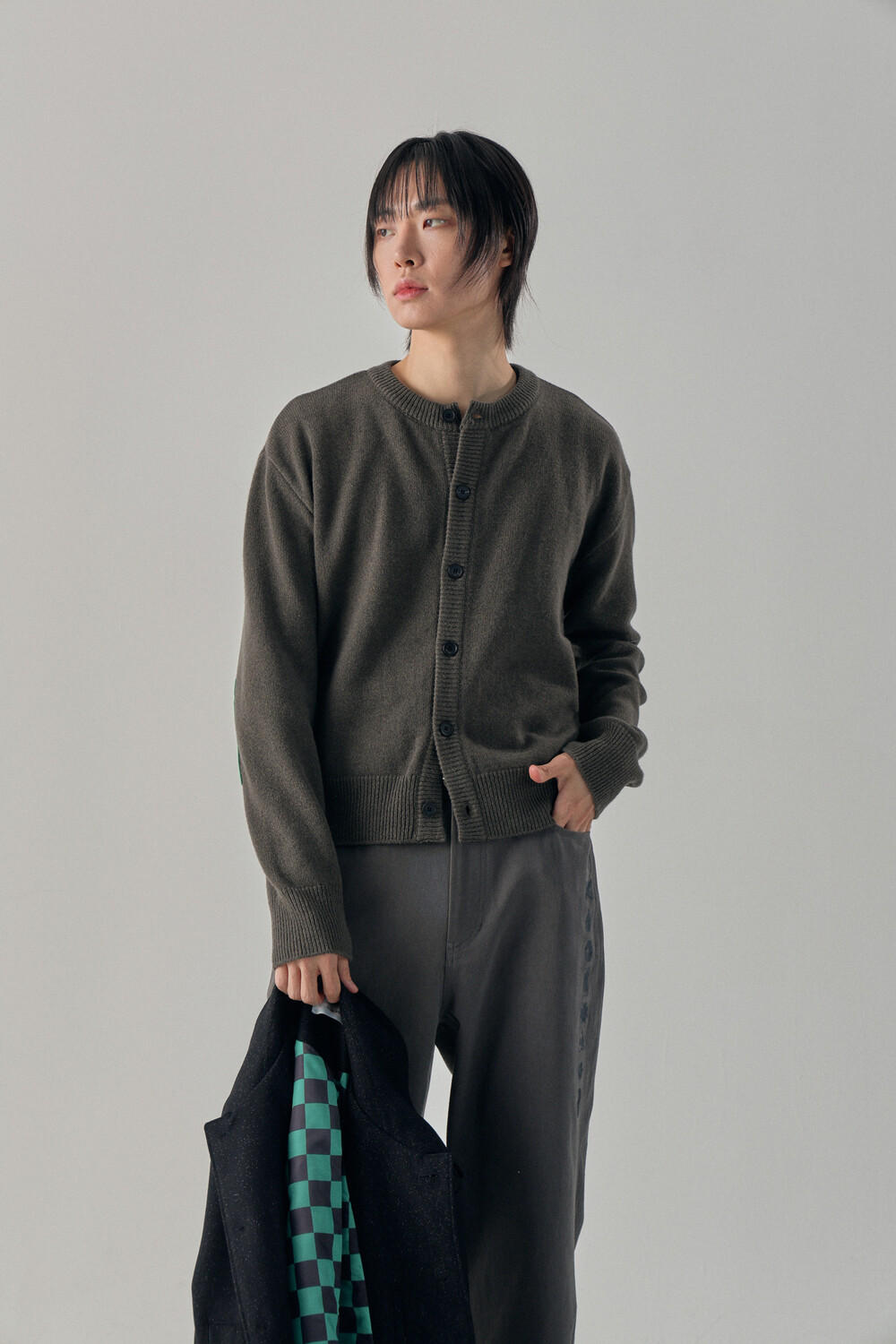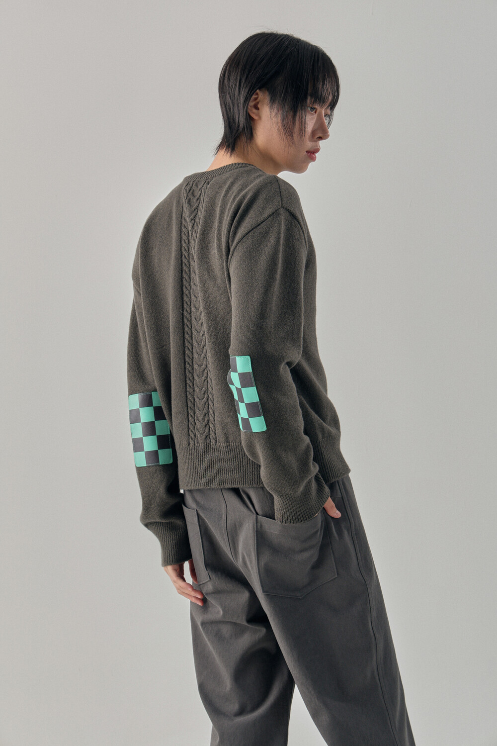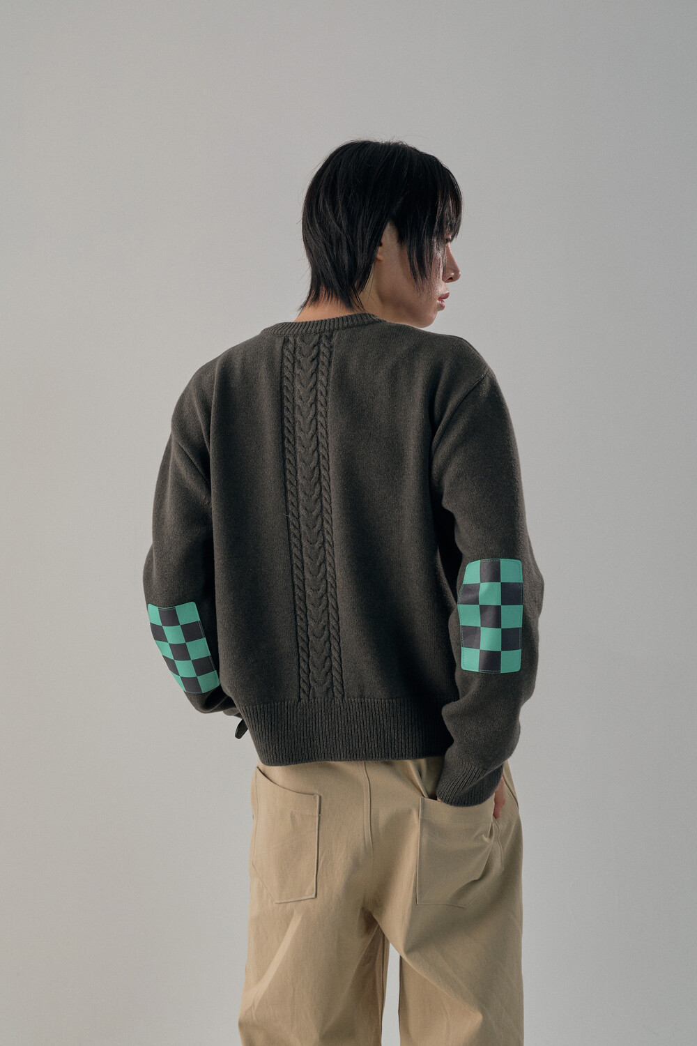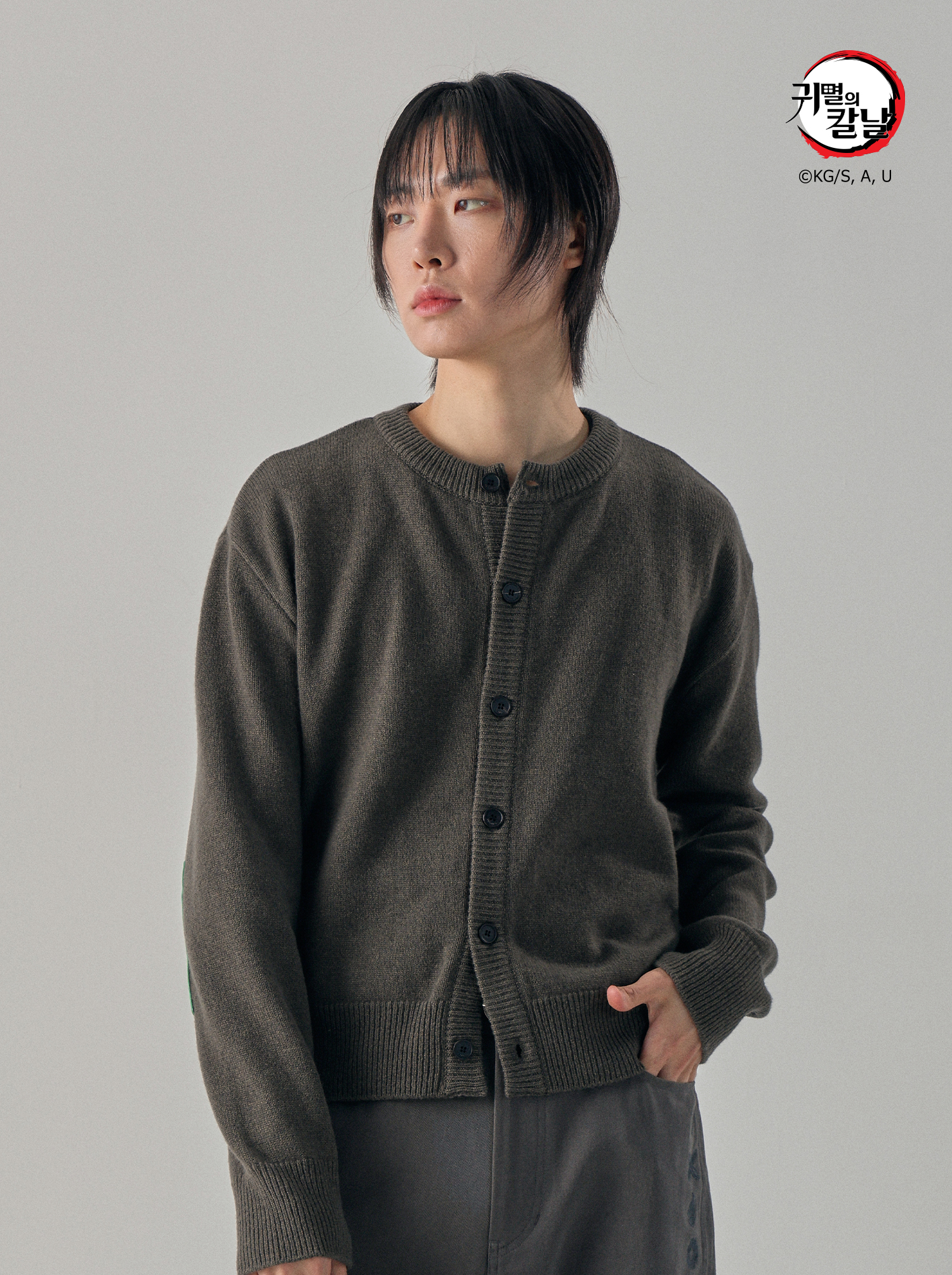Round-Neck Elbow Leather Patch Cardigan - Tanjiro