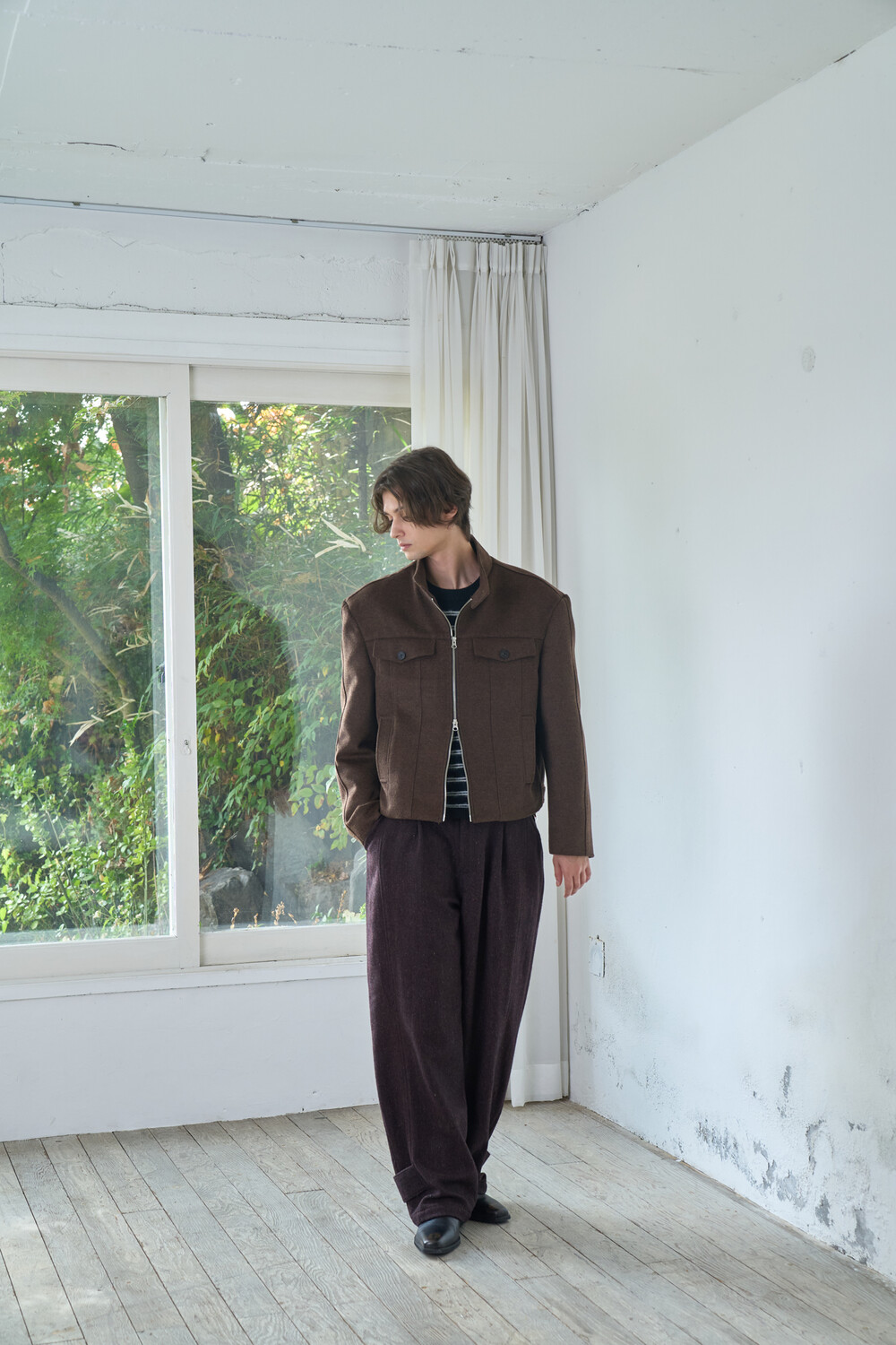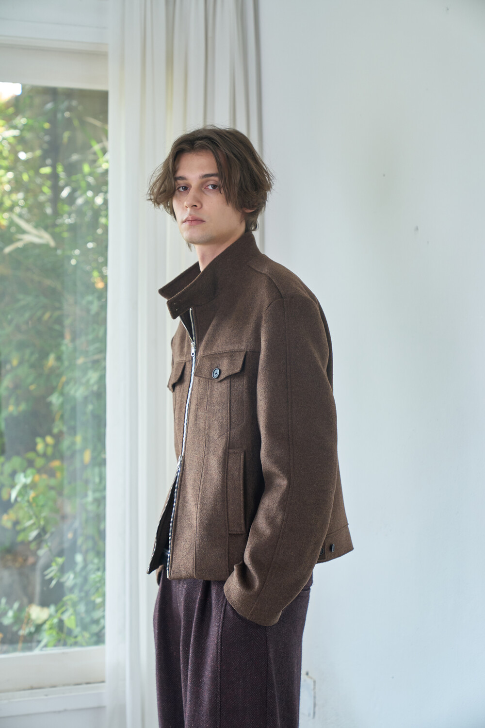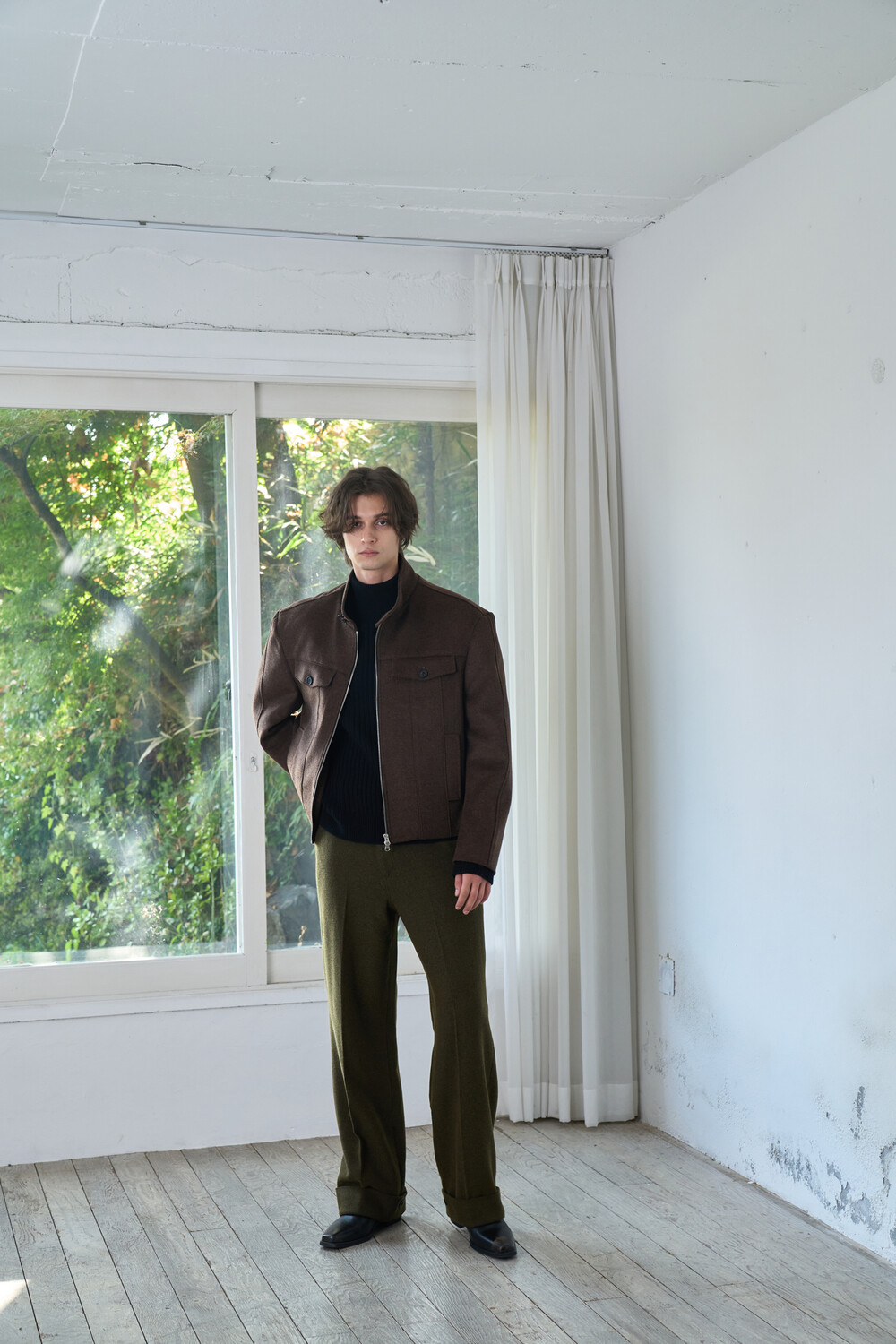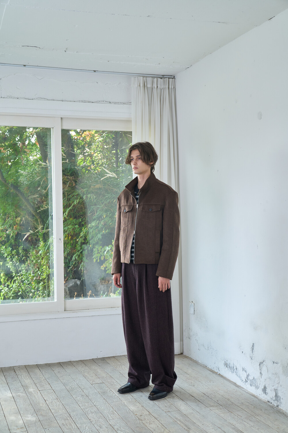 - 데드스탁 패브릭으로 제작된 직선적 형태의 해링턴 자켓 디자인