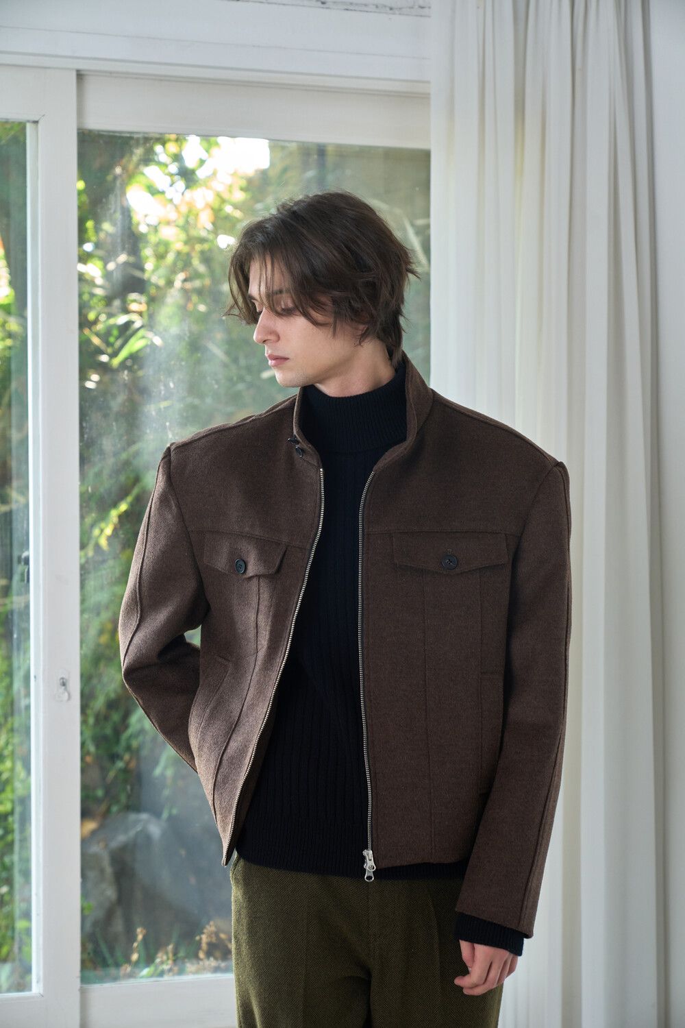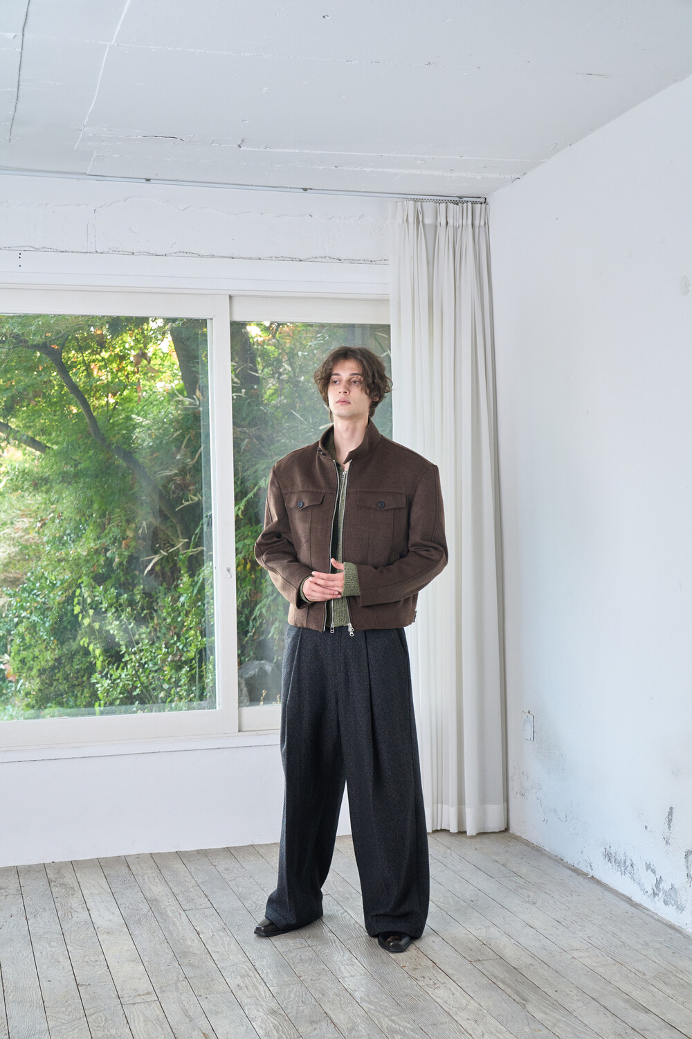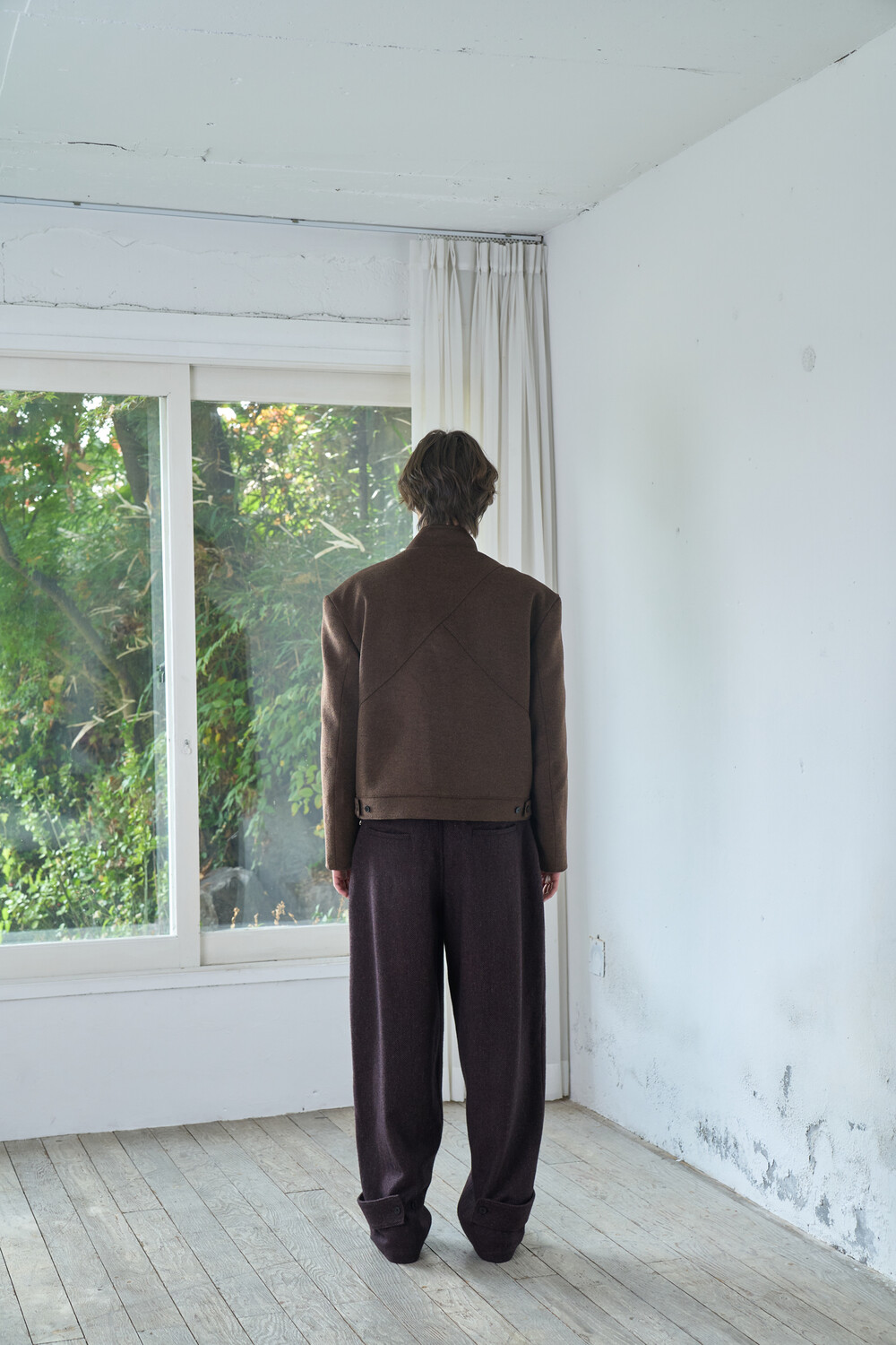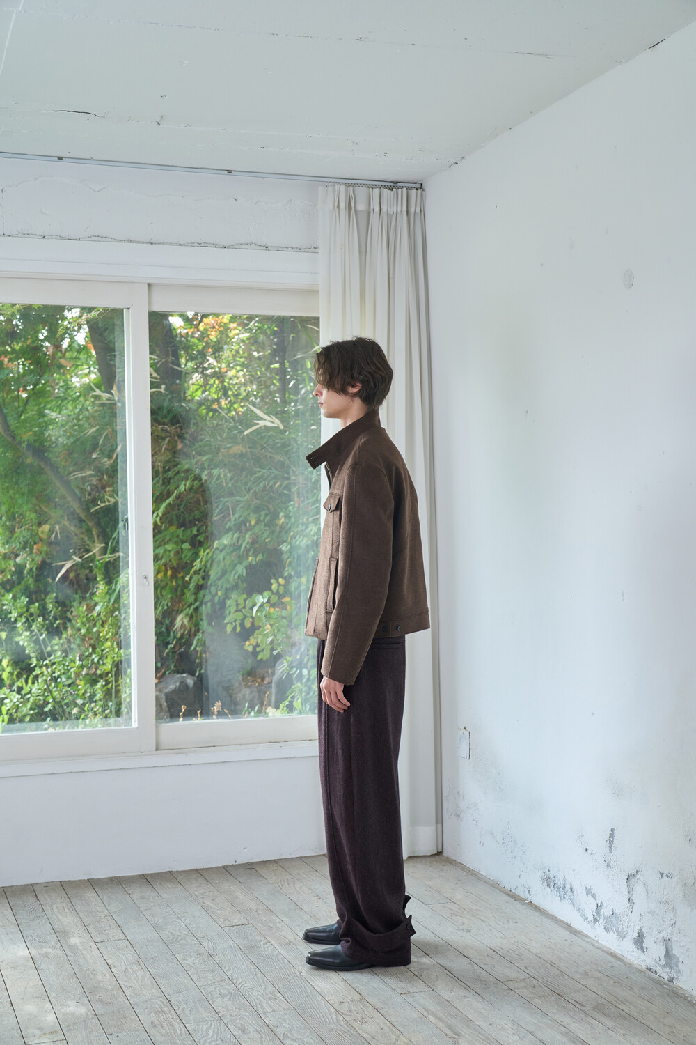 - 데드스탁 패브릭으로 제작된 직선적 형태의 해링턴 자켓 디자인