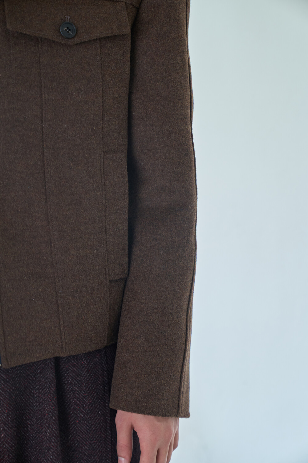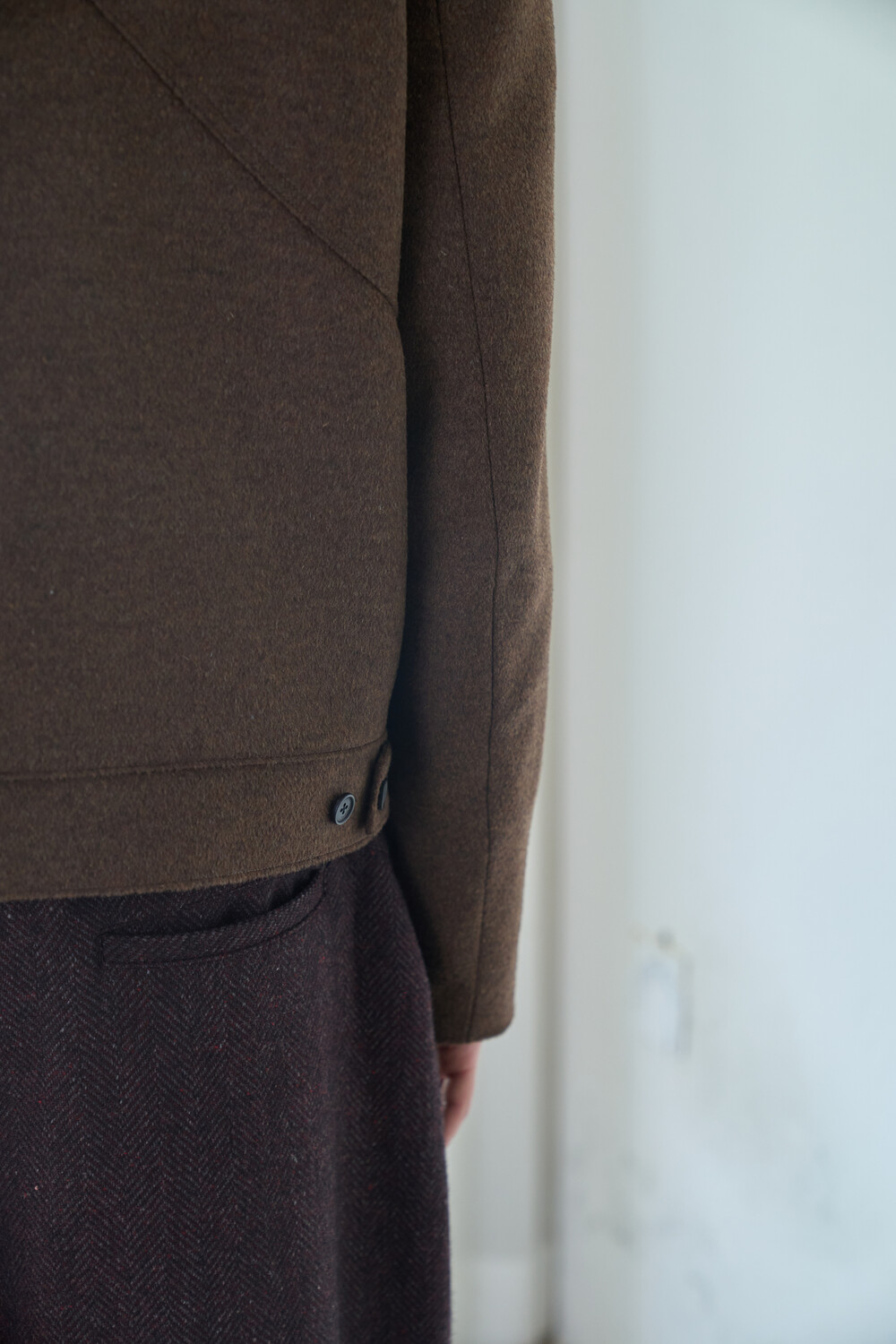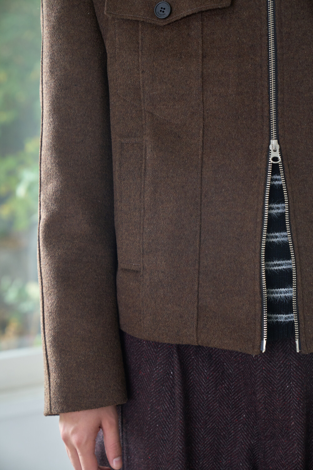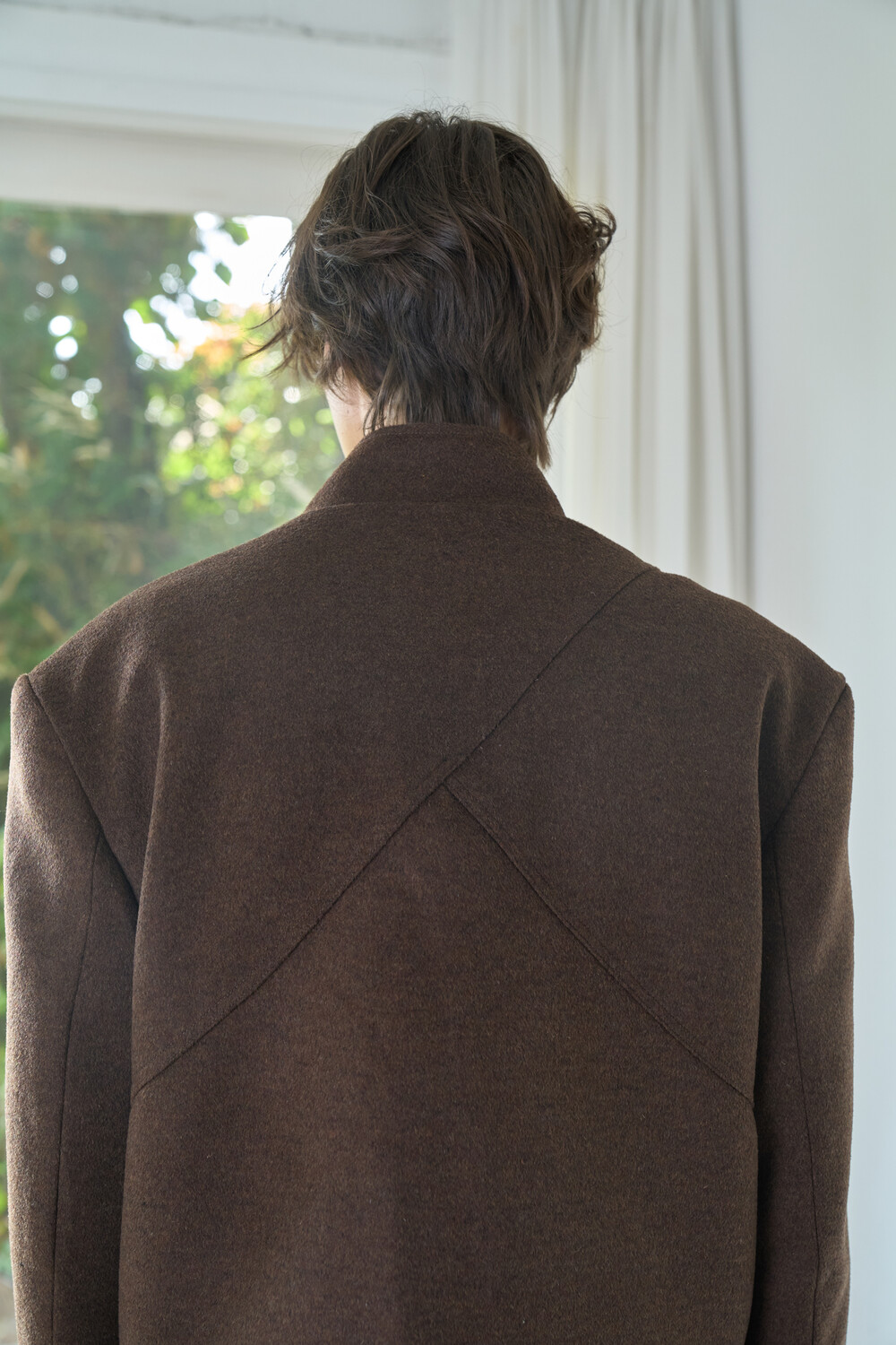 - 데드스탁 패브릭으로 제작된 직선적 형태의 해링턴 자켓 디자인