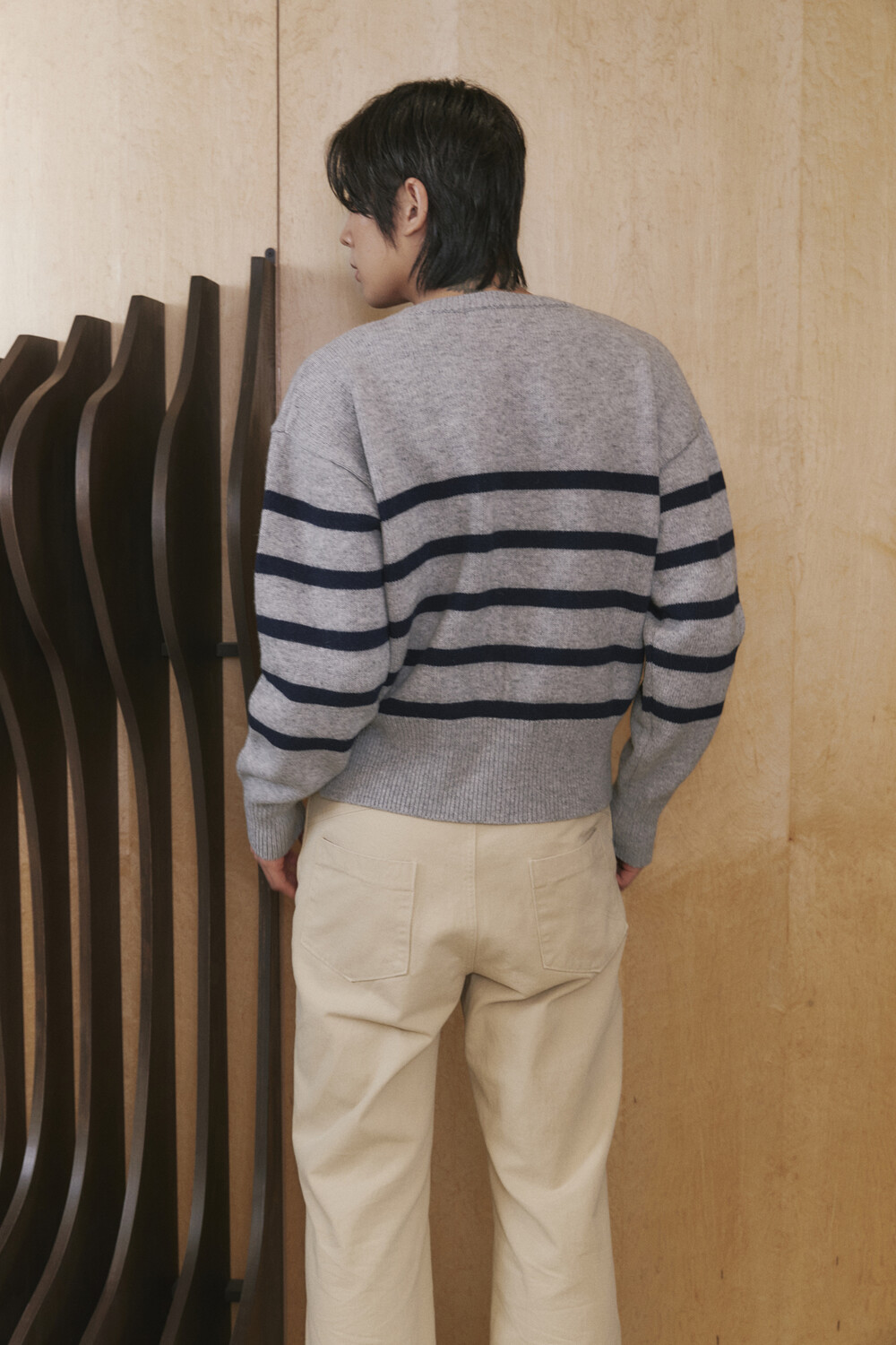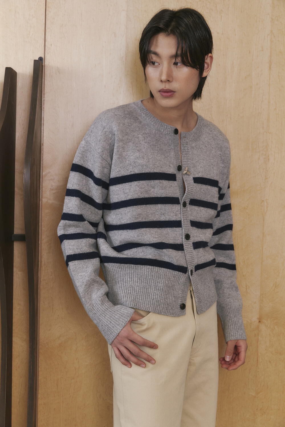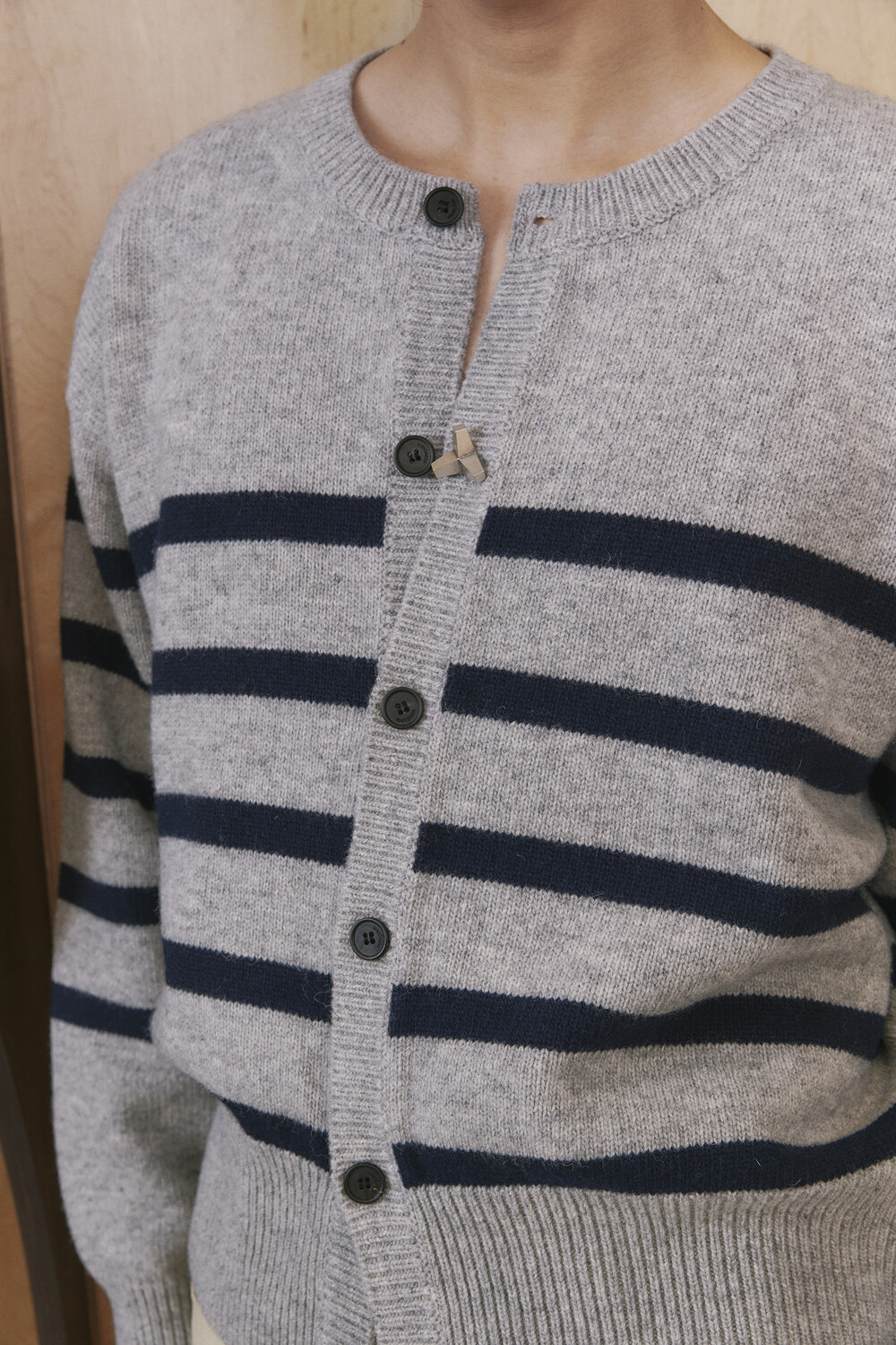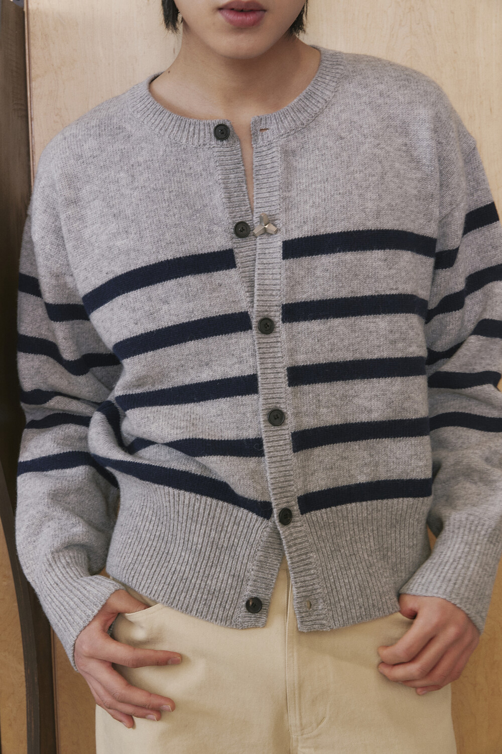 Stripe Round-neck Cardigan - Grey Navy