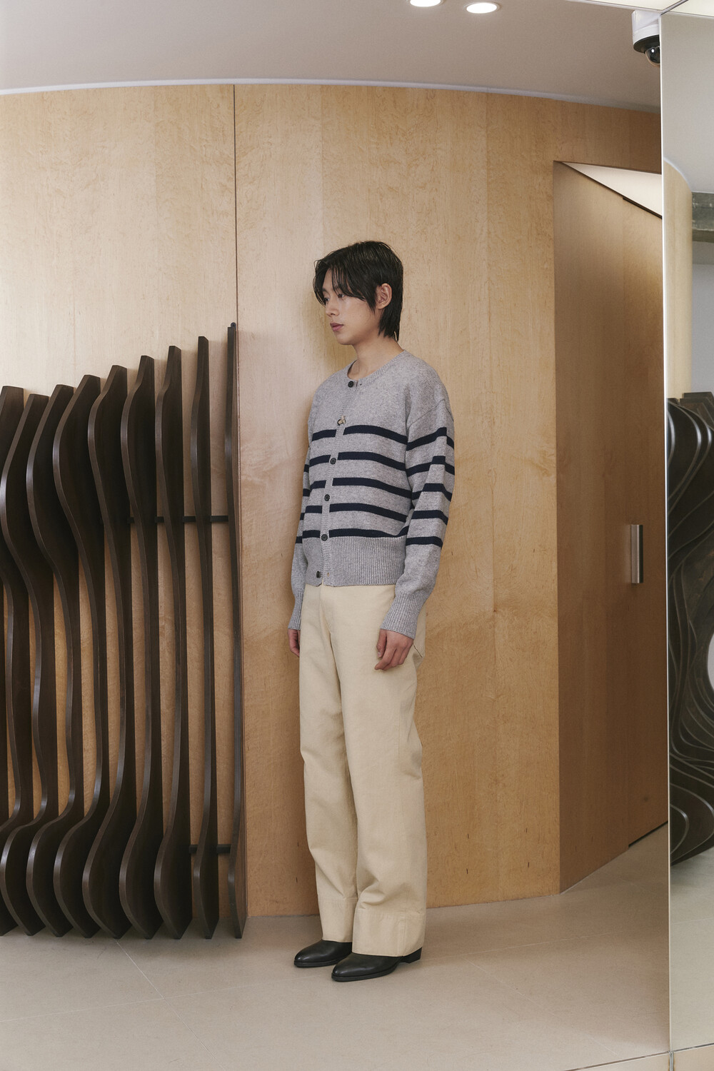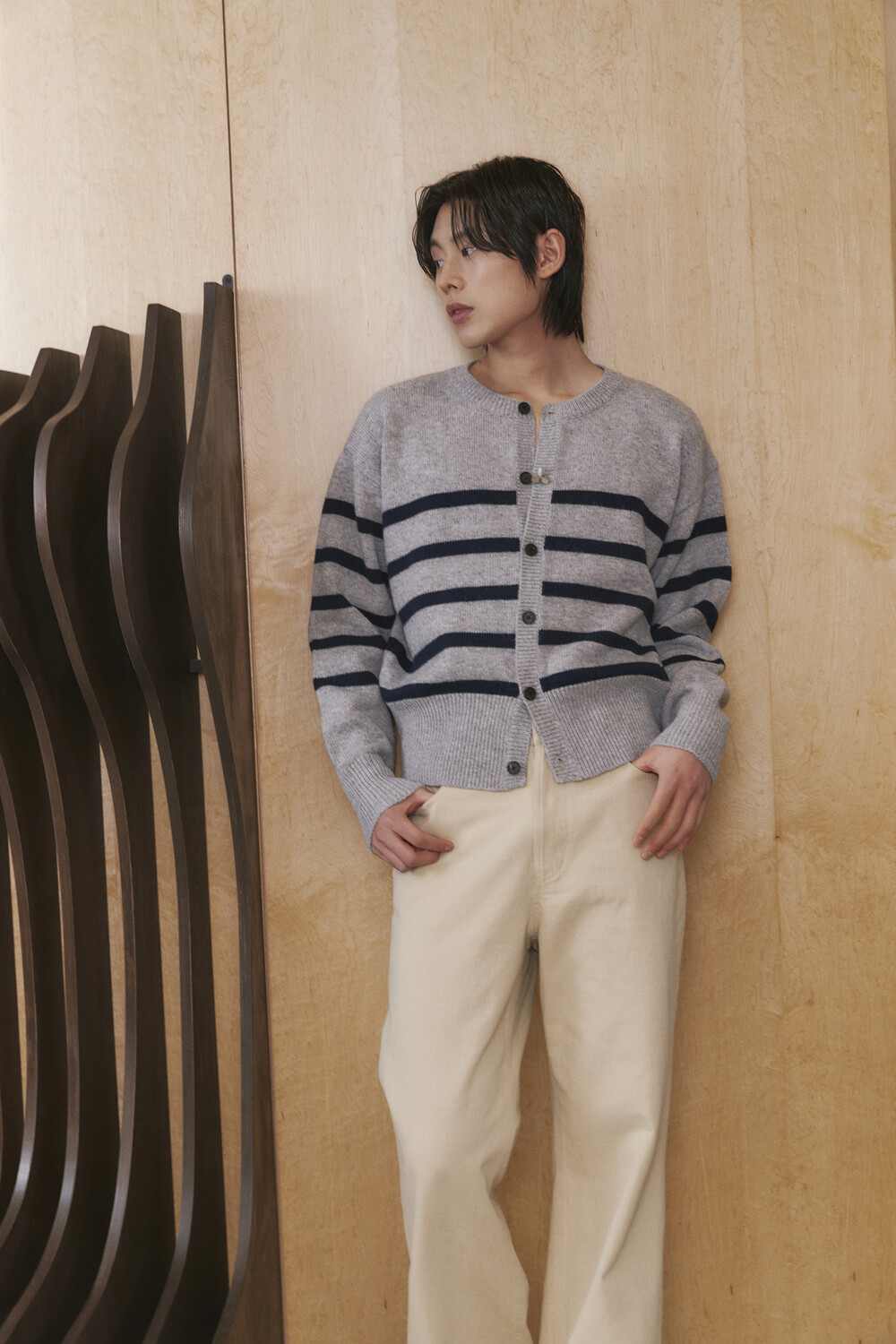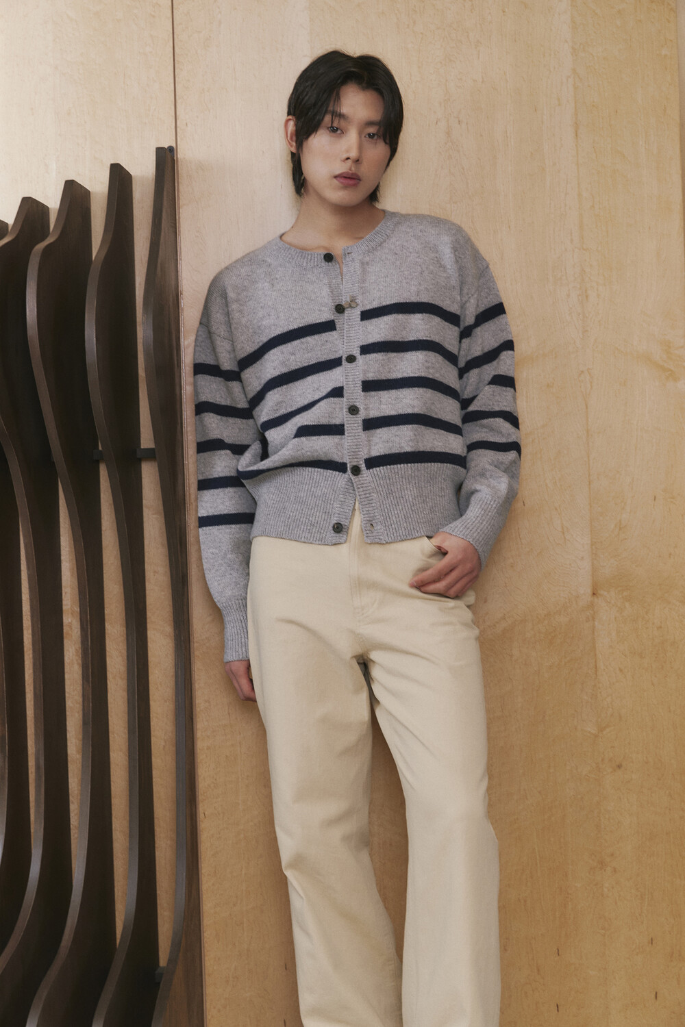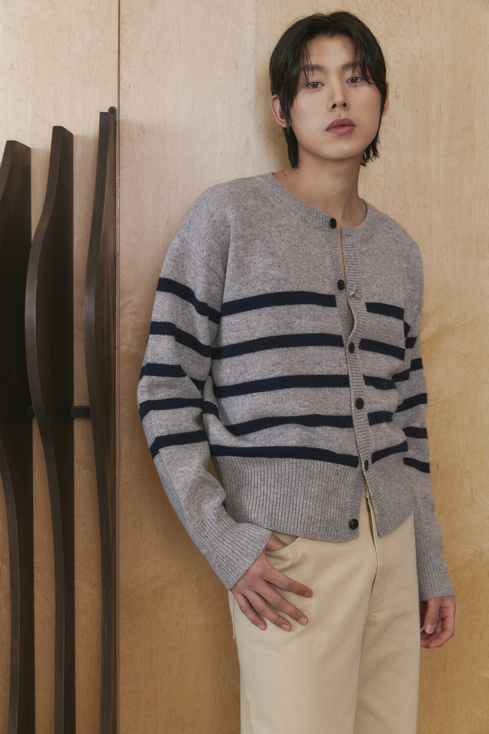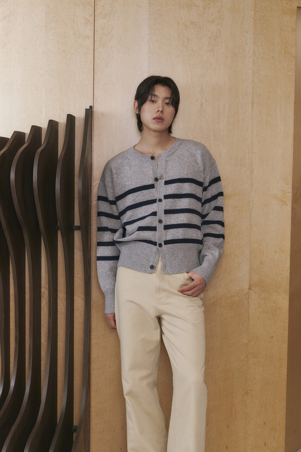 Stripe Round-neck Cardigan - Grey Navy