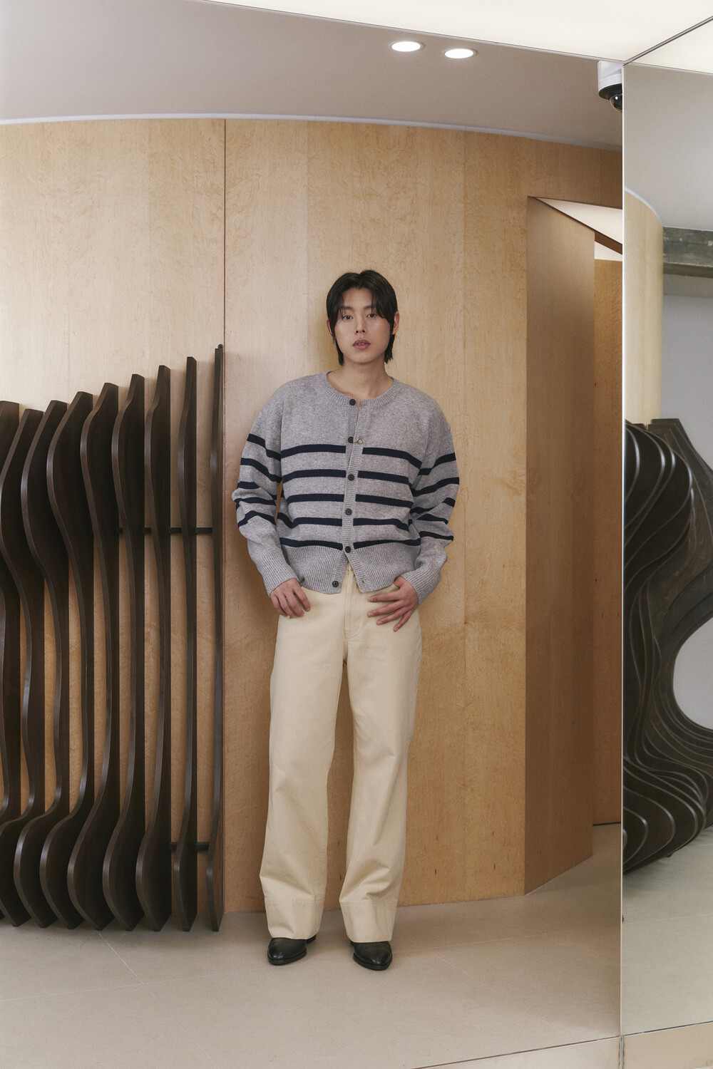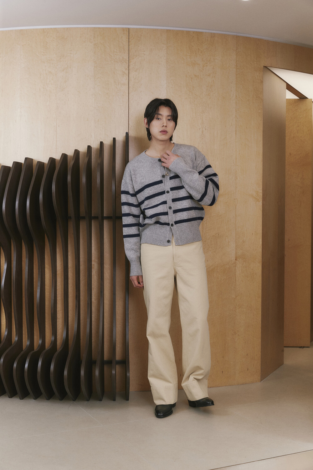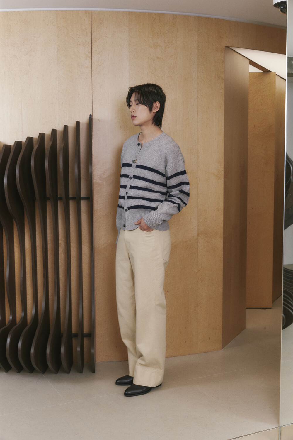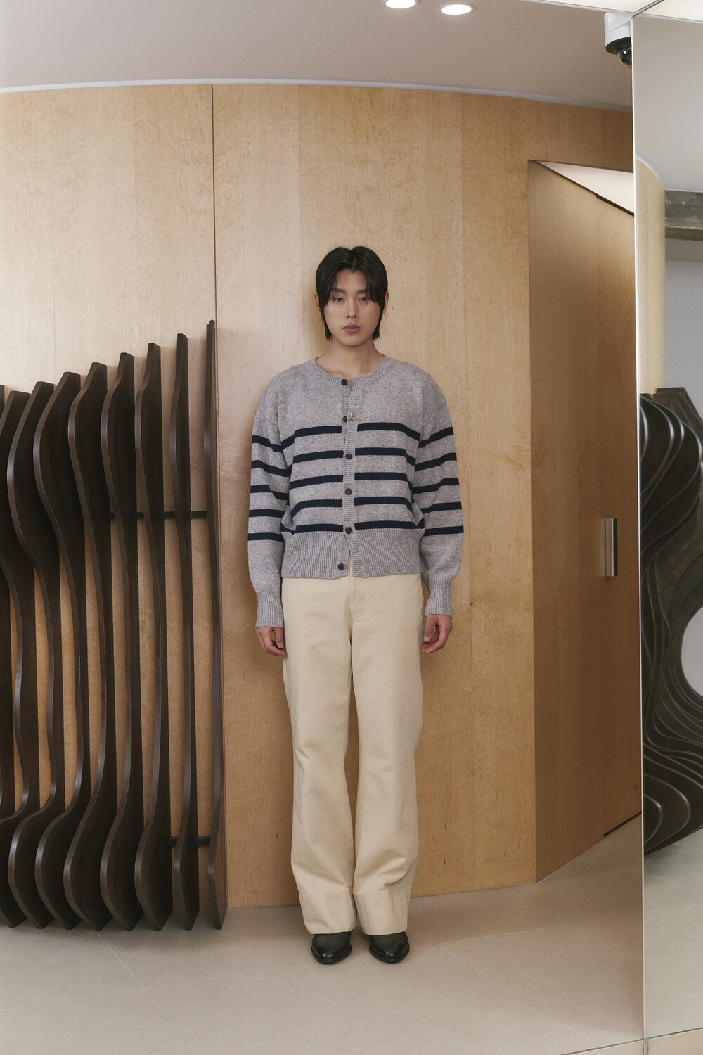 Stripe Round-neck Cardigan - Grey Navy