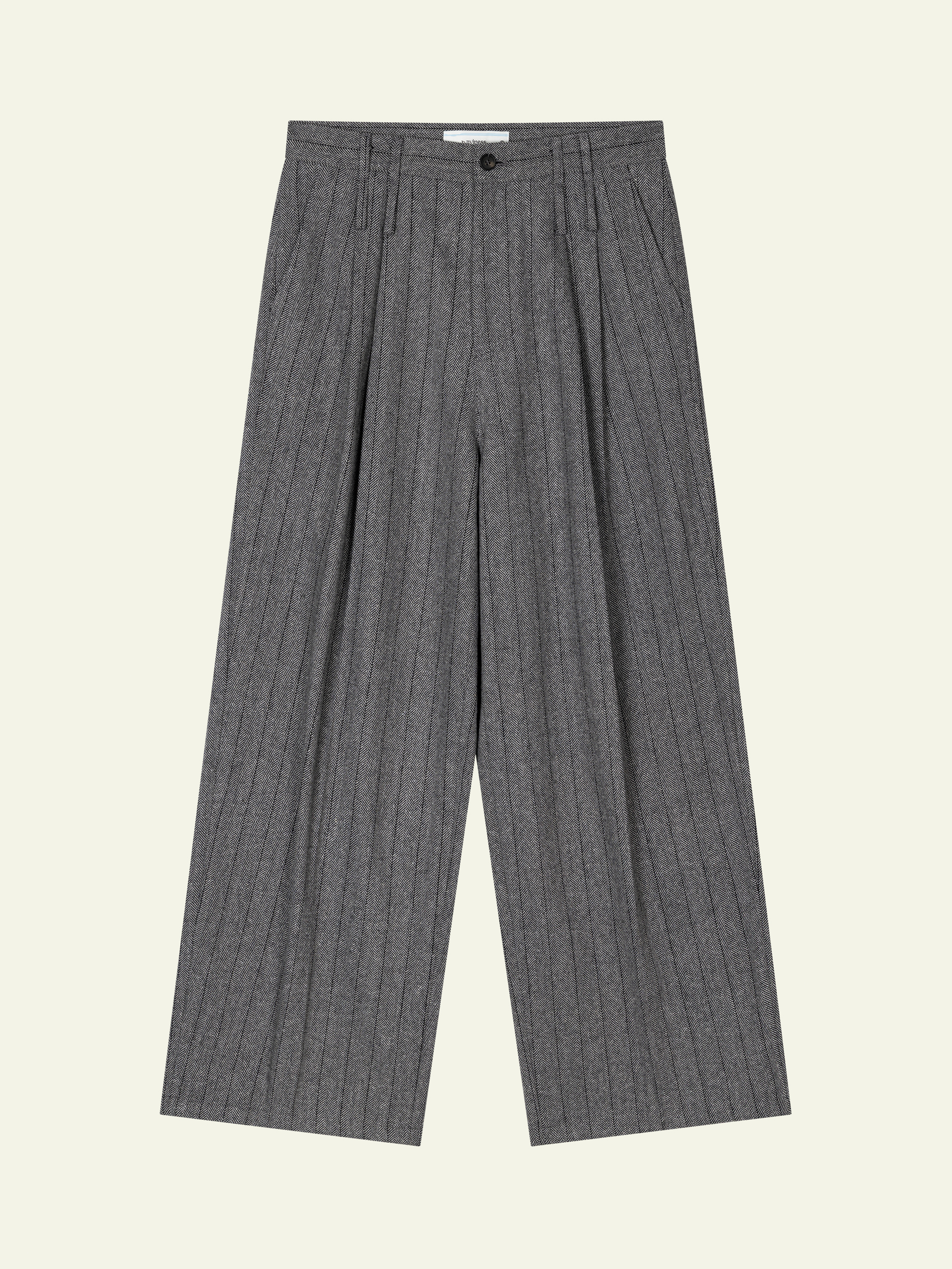 Back Leather Cinch-Back Two Tuck Trousers - Grey Herringbone